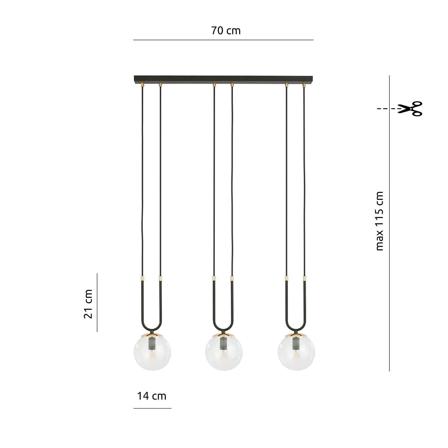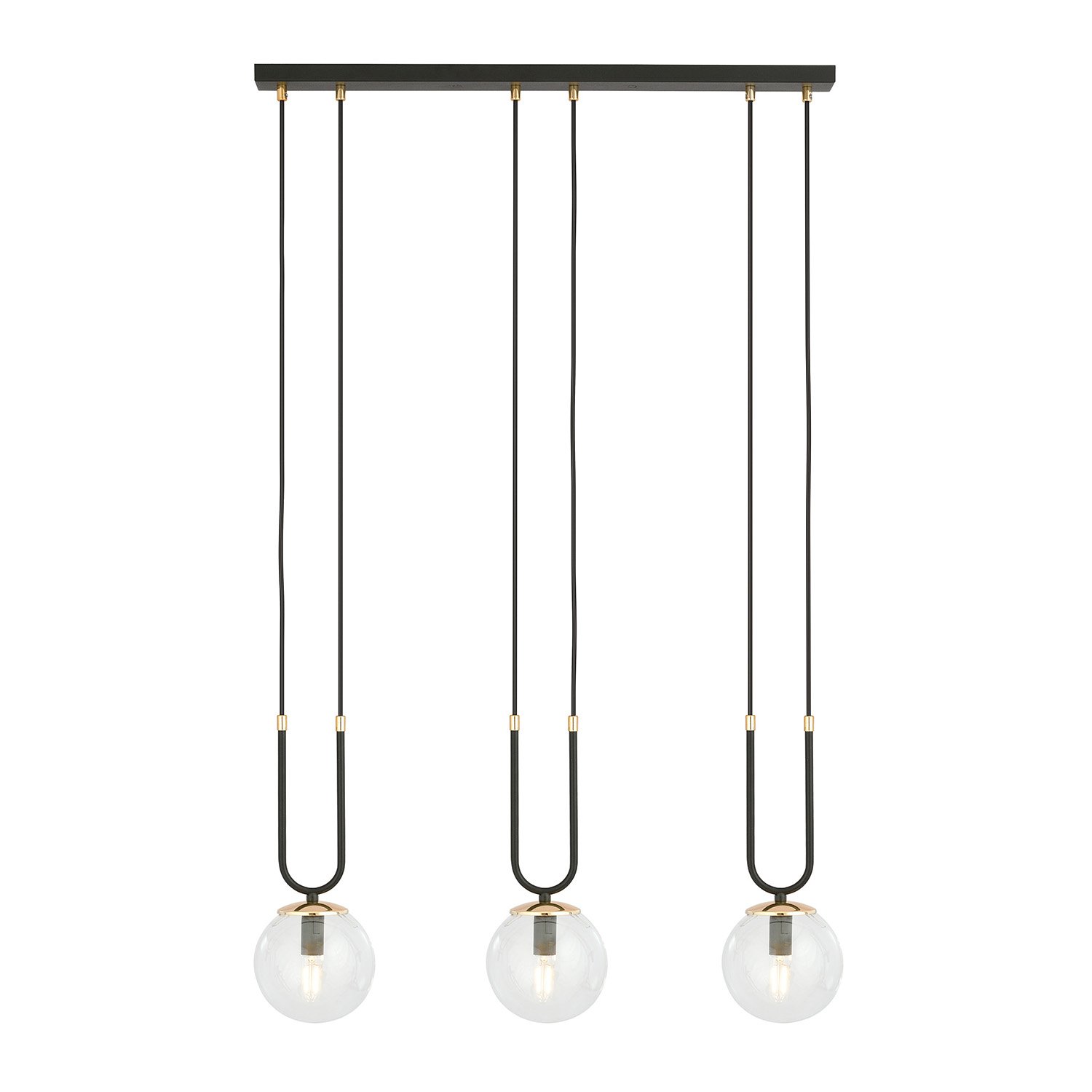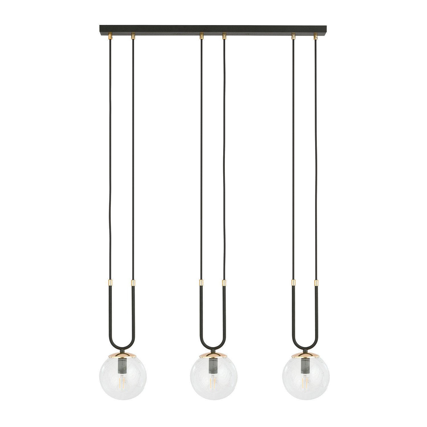 Sospensione moderna realizzata con una base in metallo di colore nero con dettagli decorativi in metallo color oro e tre paralumi sferici in vetro trasparente. Aggiungono un'atmosfera straordinaria agli interni, presentandosi incredibilmente chic ed eleganti. Questa serie unica è progettata per gli appassionati di opulenza e bellezza. I paralumi in vetro donano alla serie GLAM un tocco di delicatezza e grazia, mentre gli elementi decorativi dorati la ravvivano e illuminano.