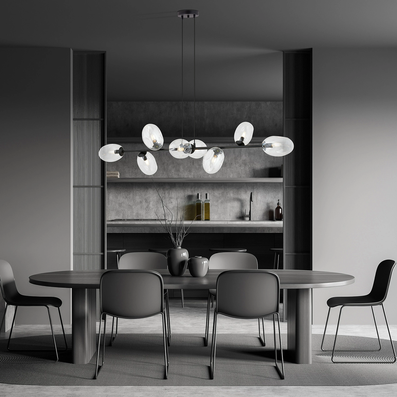 Sospensione contamporane con struttura in acciaio nero, altezza regolabile e 8 diffusori ovali in vetro trasparente incavato . Questa lampada moderna presenta una forma unica di paralumi, elegante e snella, che aggiunge fascino e individualità a qualsiasi spazio. Si abbina perfettamente a vari interni, siano essi moderni, minimalisti o più classici. La possibilità di scegliere tra diversi colori di paralume ti consente di personalizzare la lampada in base alle tue preferenze e al tuo stile di decorazione.