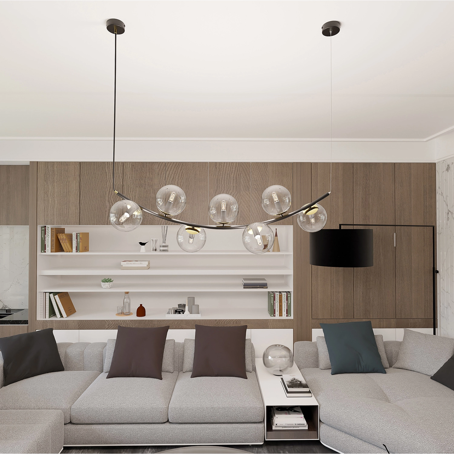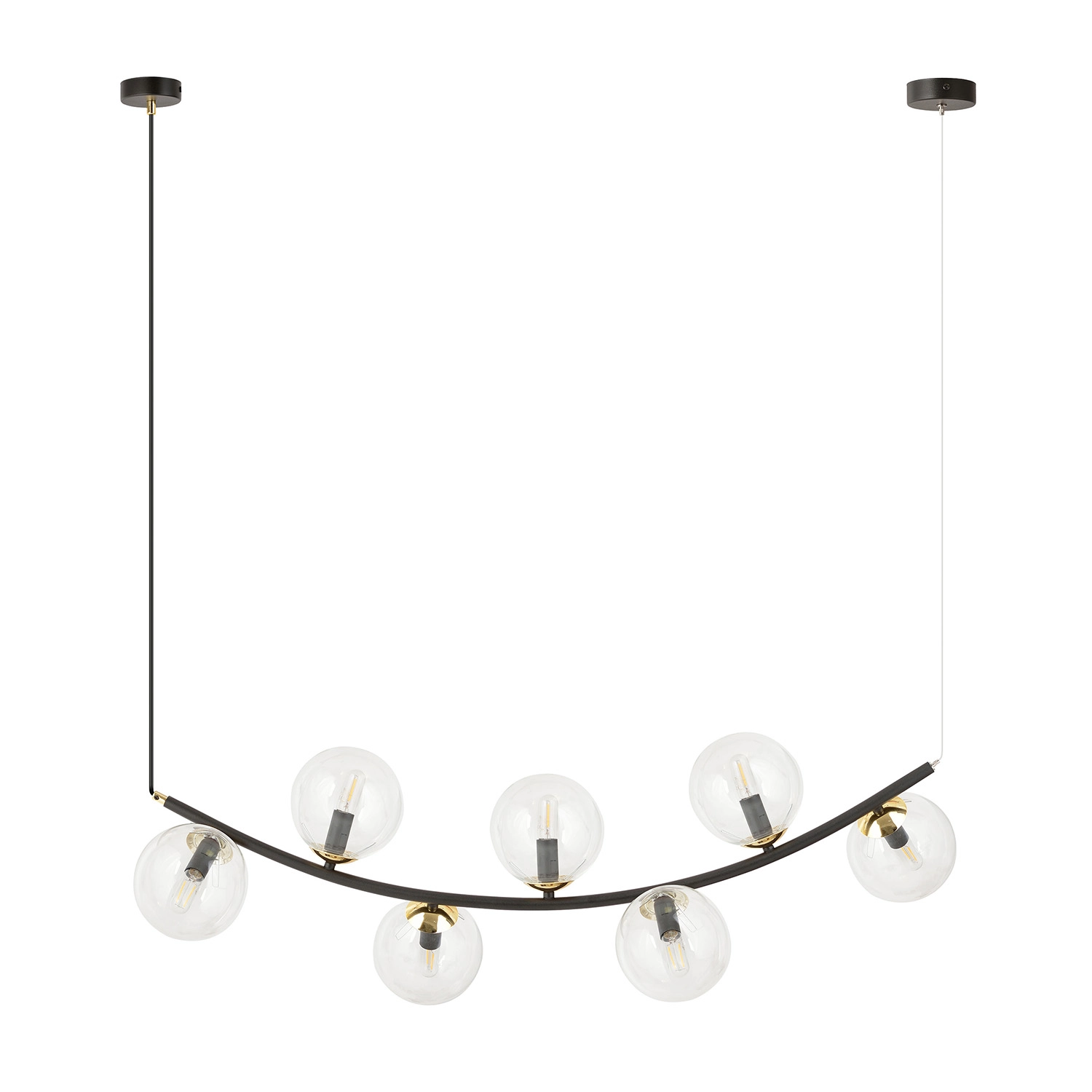 Sospensione elegante realizzata con base in acciaio nero, braccio curvo nero e dettagli color oro, su cui si appoggiano 7 diffusori sferici in vetro trasparente. Realizzato in acciaio nero, si abbina perfettamente al paralume trasparente. La lampada, a forma di semicerchio con paralumi irregolarmente distanziati, conferisce agli interni un carattere distintivo, sottolineandone lo stile moderno e sofisticato. Questa lampada è la scelta perfetta per chi vuole rivitalizzare il proprio spazio, creando un'illuminazione che sia sia funzionale che estetica.