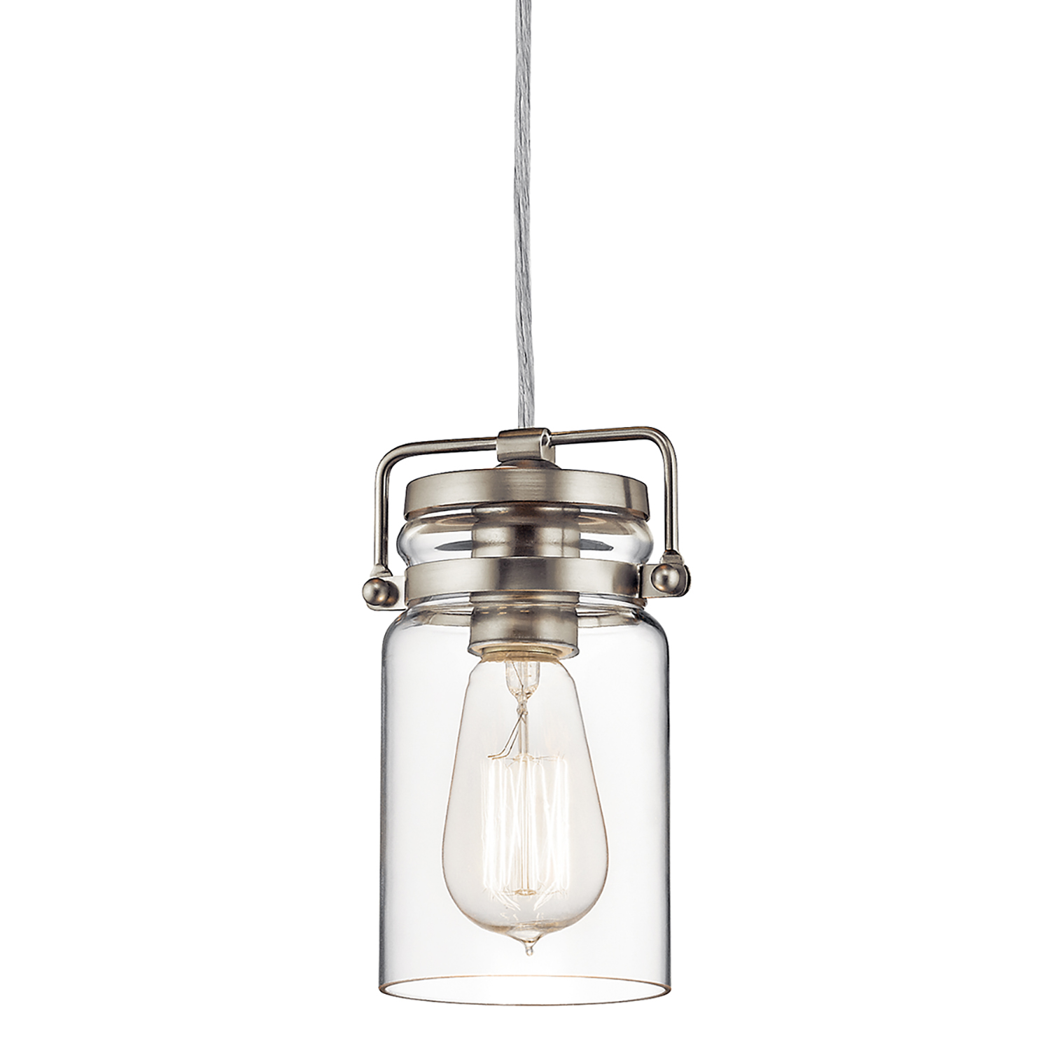Mini lampada a sospensione a 1 luce. Lo stile vintage della collezione Brinley conferisce un carattere moderno alla familiarità e alla comodità dei barattoli da conserva. Utilizzata in gruppo o da sola, la collezione Brinley è un nuovo tocco per la casa, con finiture in nichel spazzolato o bronzo antico.