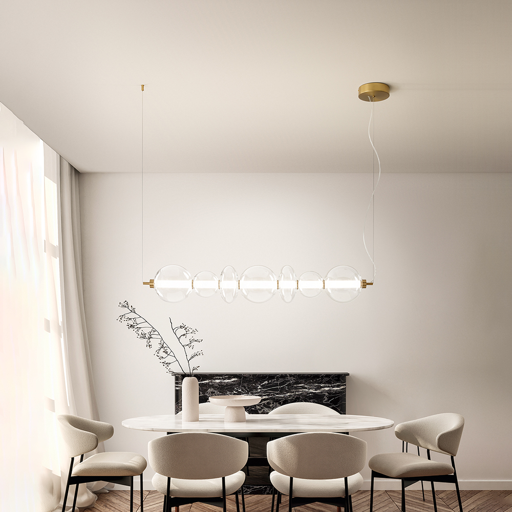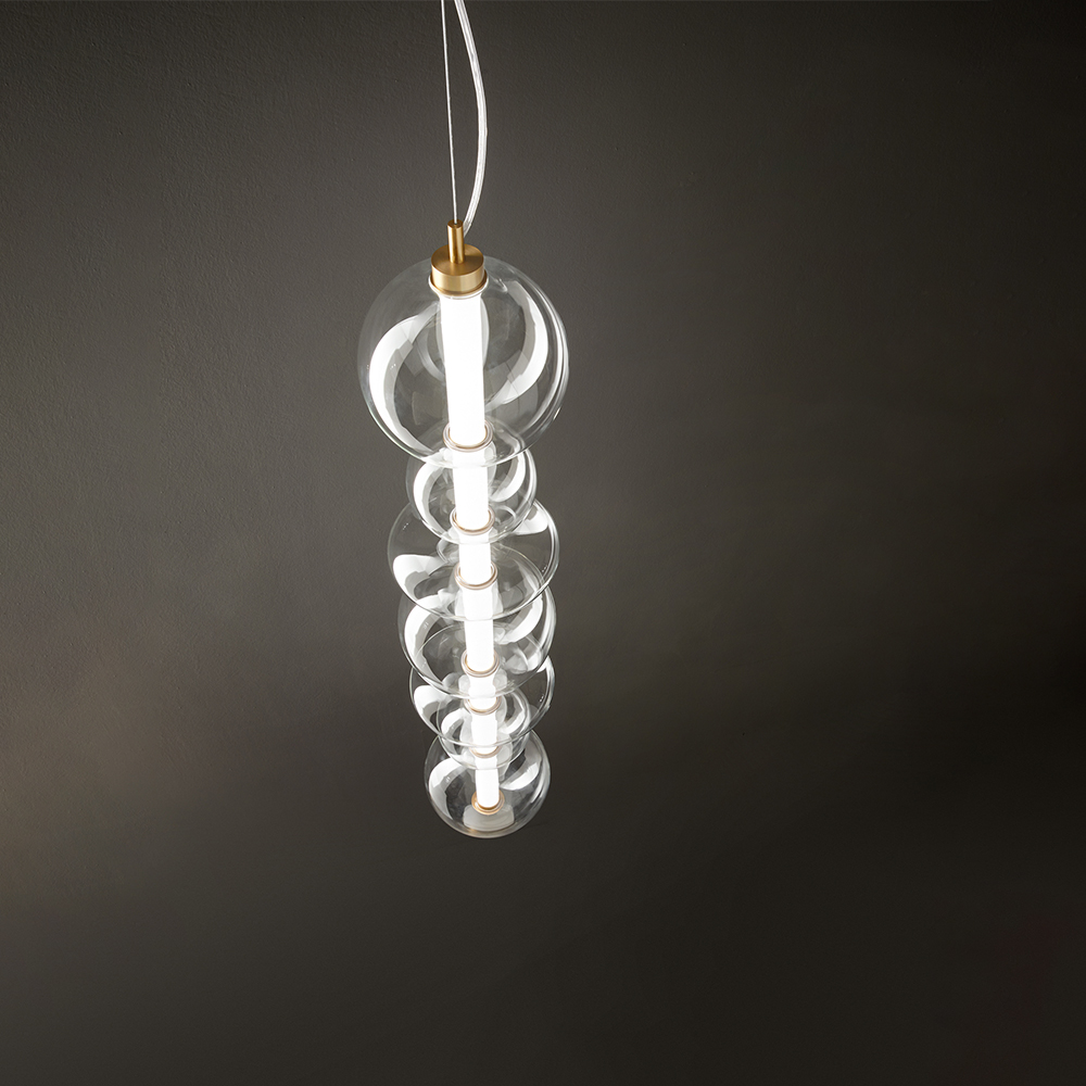 Collezione BubblesELEGANTI BOLLE DI LUCESospensione in metallo e alluminio oro spazzolato Led 37W 3040LM 3000K D.20 x L 78 cm / H.cavo reg 150 cm. Collezione con str..