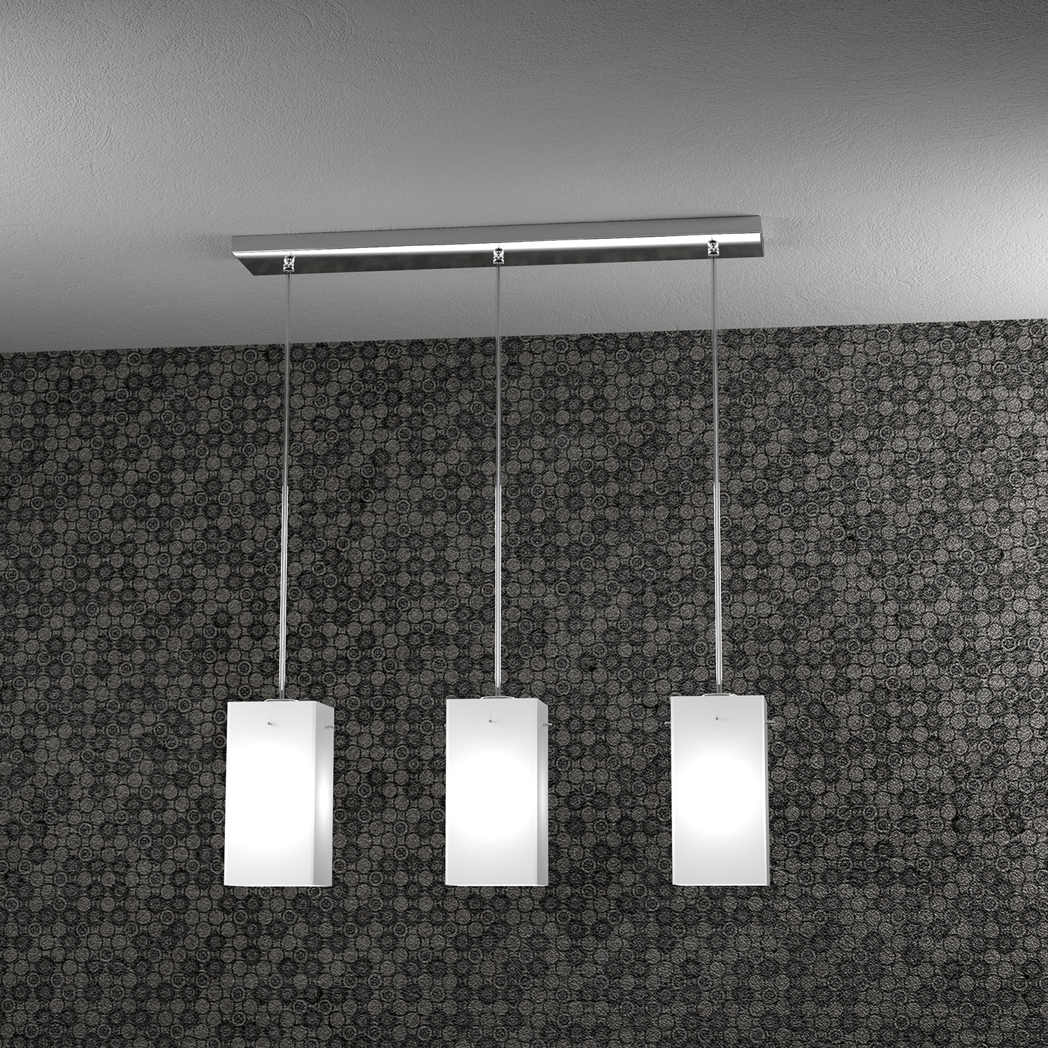 Sospensione con struttura metallica cromata costituite da un diffusore in vetro soffiato e acidato opaco di forma quadrata.. Ogni vetro misura 10cm per lato, è alto 20cm ed è fissato al supporto metallico cromato mediante dei perni filettati. Le sospensioni sono tutte regolabili in altezza mediante gli appositi serracavi.Questo articolo è disponibile in diverse finiture e/o dimensioni. E' possibile indicarlo nell'apposito campo NOTE presente in conclusione di ordine oppure contattarci dopo aver effettuato l'ordine.