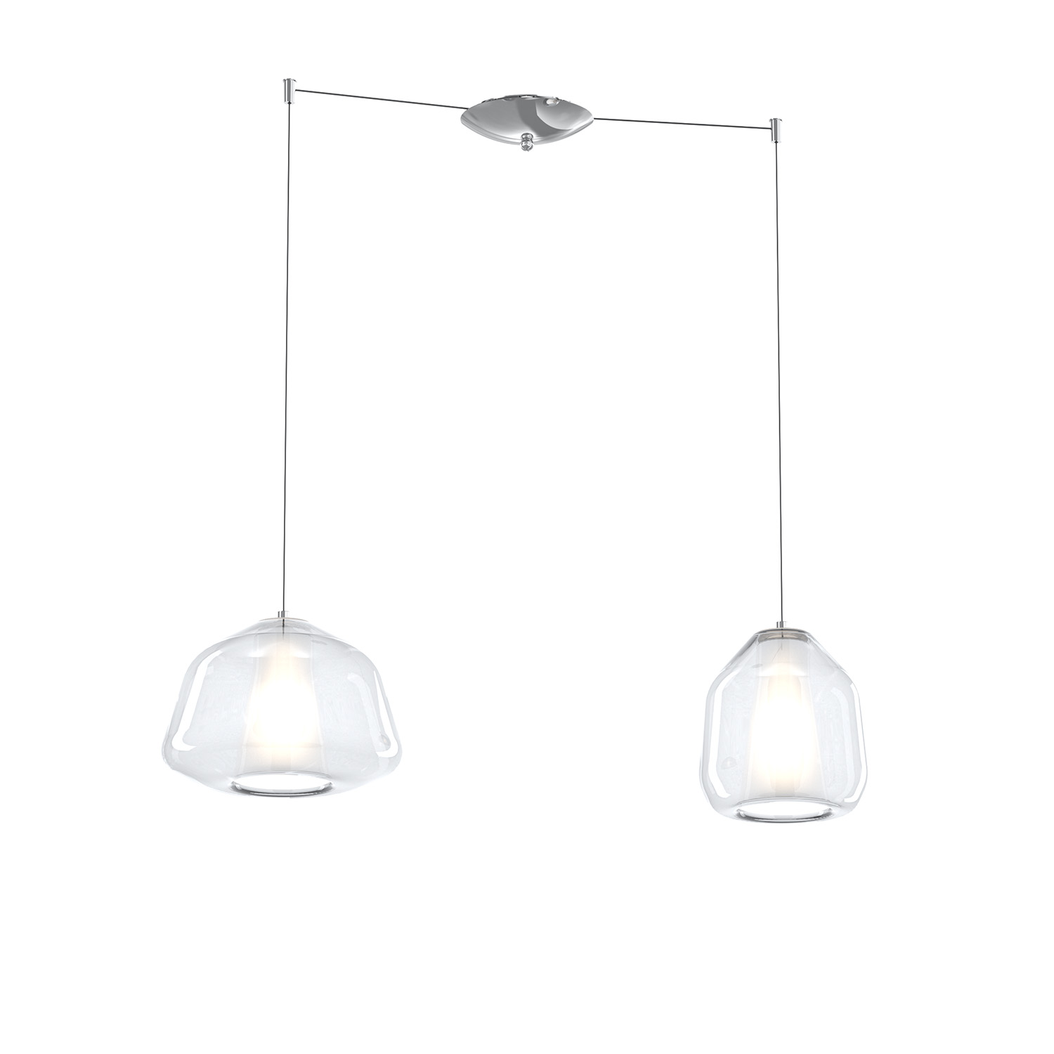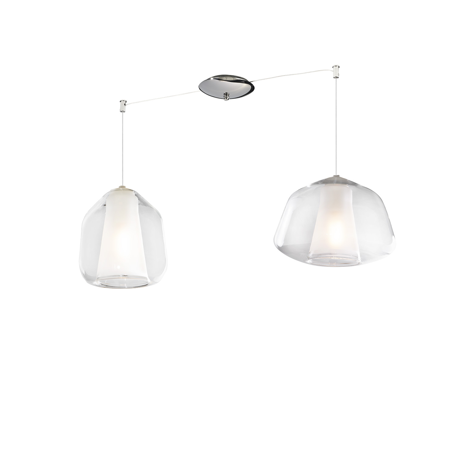 Sospensione 2 luci composta da una struttura in metallo color cromo con decentratori e 2 diffusori in vetro pirex soffiato colore trasparente.. Due vetri sono differenti fra loro. Ogni elemento è disponibile in 3 forme differenti (Alpha, Beta e Gamma) ed è caratterizzato da un doppio vetro, bianco all'interno e in diverse colorazioni all'esterno. Inoltre anche la struttura è disponibile in finiture Ottone Satinato e Bianco.Questo articolo è disponibile in diverse finiture e/o dimensioni. E' possibile indicarlo nell'apposito campo NOTE presente in conclusione di ordine oppure contattarci dopo aver effettuato l'ordine.
