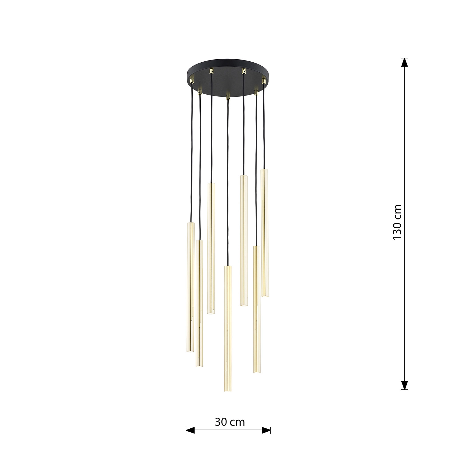Collezione ShuLA TUA CASA, IL TUO STILE, LA TUA LUCELampada a sospensione in acciaio 7 luci con base tonda e diffusori a forma di tubolari lunghi oro. I tubi dorati..