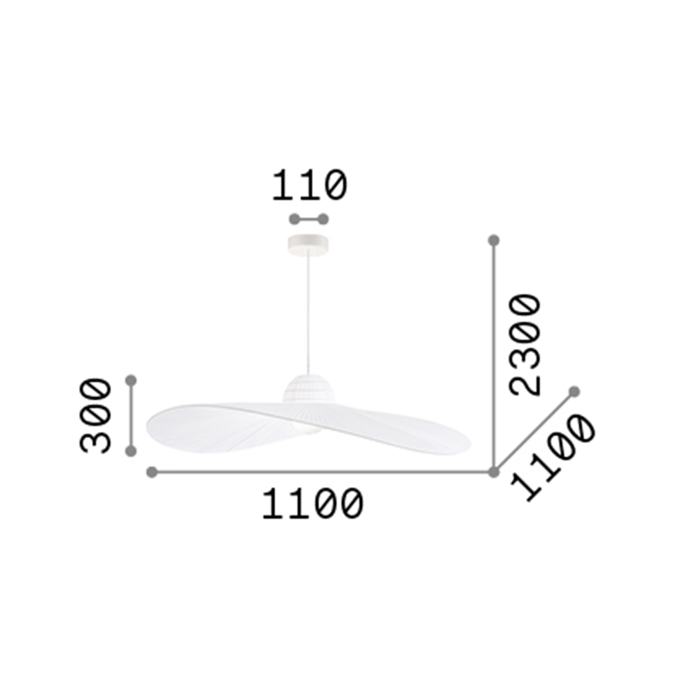 Collezione MADAMECHAPEAUSospensione a 1 luce con rosone in metallo verniciato bianco opaco. Cavo in tessuto. Diffusore con telaio metallico avvolto da nastro in tess..