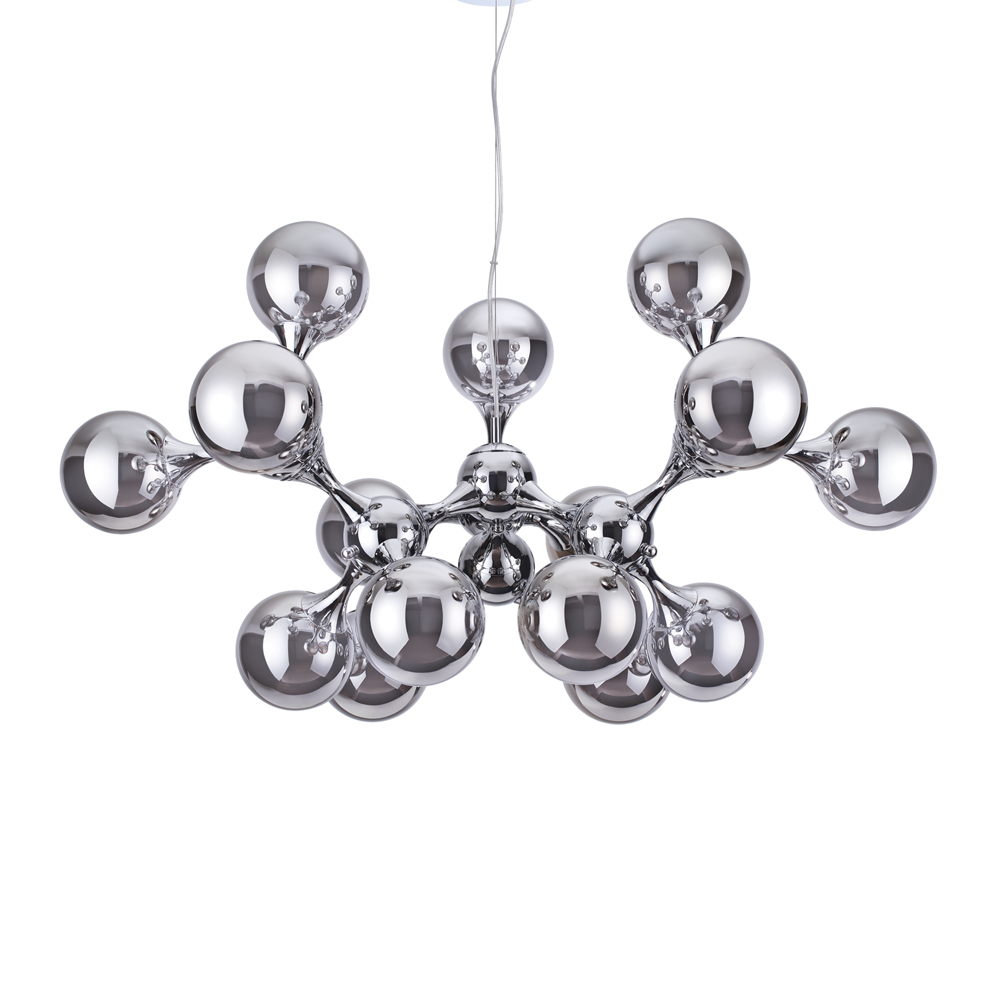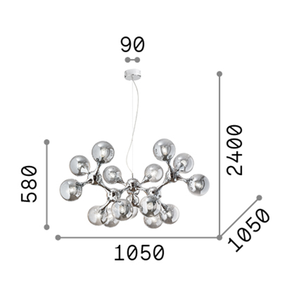 Sospensione a 15 luci con montatura in metallo con finitura cromo. Diffusori in vetro trasparente soffiato e cromato. Cavi in acciaio regolabili..