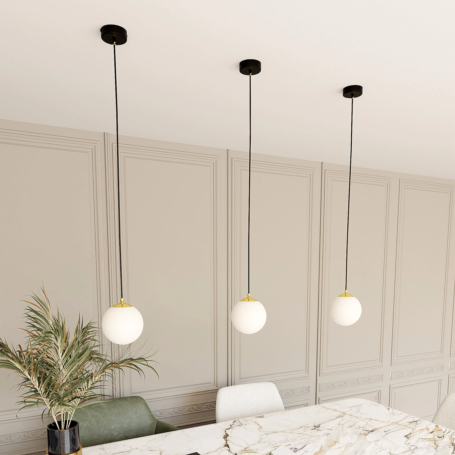 Sospensione contemporanea 1 luce con rosone in acciaio nero, dettagli oro e diffusore a sfera in vetro bianco, ad altezza regolabile. La loro costruzione semplice con base rotonda a soffitto li rende molto versatili e adatti a vari ambienti, come la cucina, il soggiorno o la sala da pranzo. Inoltre, le lampade da soffitto della serie Nuada hanno un tocco di oro lucido, che aggiunge loro eleganza e leggerezza.