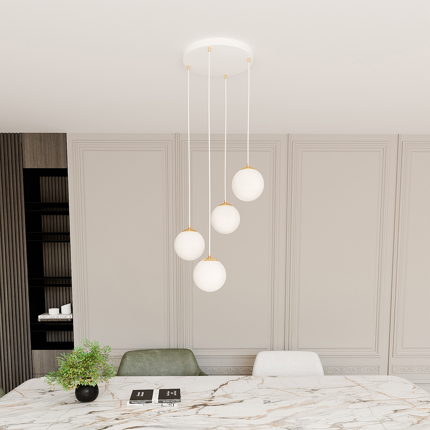 Sospensione contemporanea 4 luci con rosone tondo in acciaio bianco, dettagli oro e diffusori a sfera in vetro bianco, ad altezza regolabile. La loro costruzione semplice con base rotonda a soffitto li rende molto versatili e adatti a vari ambienti, come la cucina, il soggiorno o la sala da pranzo. Inoltre, le lampade da soffitto della serie Nuada hanno un tocco di oro lucido, che aggiunge loro eleganza e leggerezza.