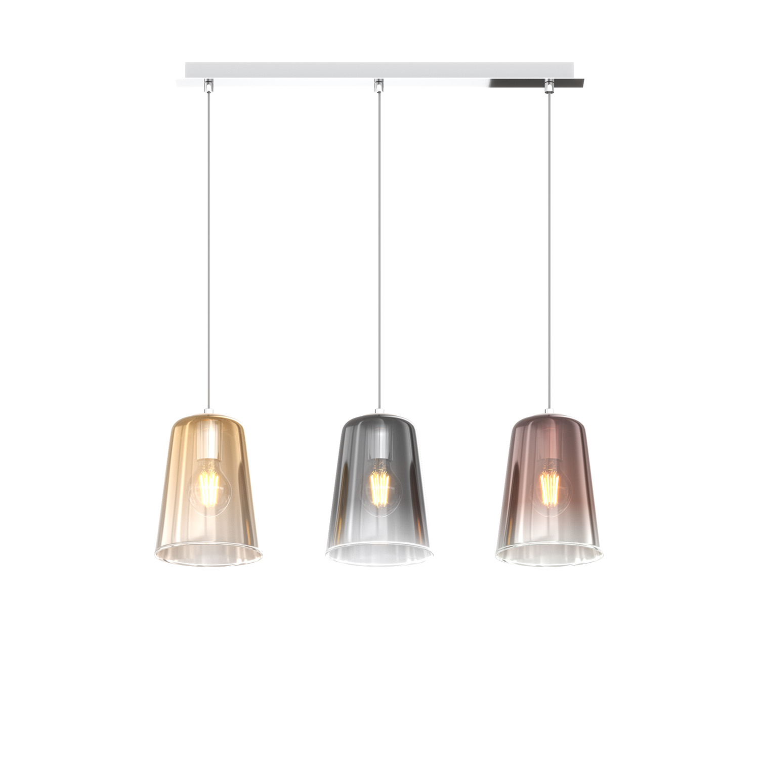 Sospensione 3 luci con struttura in metallo cromo e rosone rettangolare e con 3 coni in vetro pirex soffiato multicolor.. Le finiture dei vetri cromo, rame e ambra sono trattamenti superficiali sfumati verso il basso. Le strutture in metallo sono disponibili nelle finiture cromo, bianco e ottone satinato. La serie viene completata da una lampada da appoggioQuesto articolo è disponibile in diverse finiture e/o dimensioni. E' possibile indicarlo nell'apposito campo NOTE presente in conclusione di ordine oppure contattarci dopo aver effettuato l'ordine.