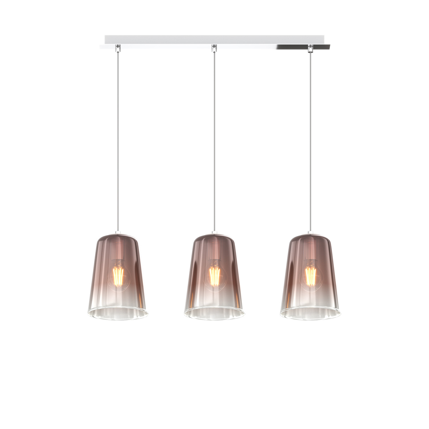 Sospensione 3 luci con struttura in metallo cromo e rosone rettangolare e con 3 coni in vetro pirex soffiato colore rame.. Le finiture dei vetri cromo, rame e ambra sono trattamenti superficiali sfumati verso il basso. Le strutture in metallo sono disponibili nelle finiture cromo, bianco e ottone satinato. La serie viene completata da una lampada da appoggioQuesto articolo è disponibile in diverse finiture e/o dimensioni. E' possibile indicarlo nell'apposito campo NOTE presente in conclusione di ordine oppure contattarci dopo aver effettuato l'ordine.