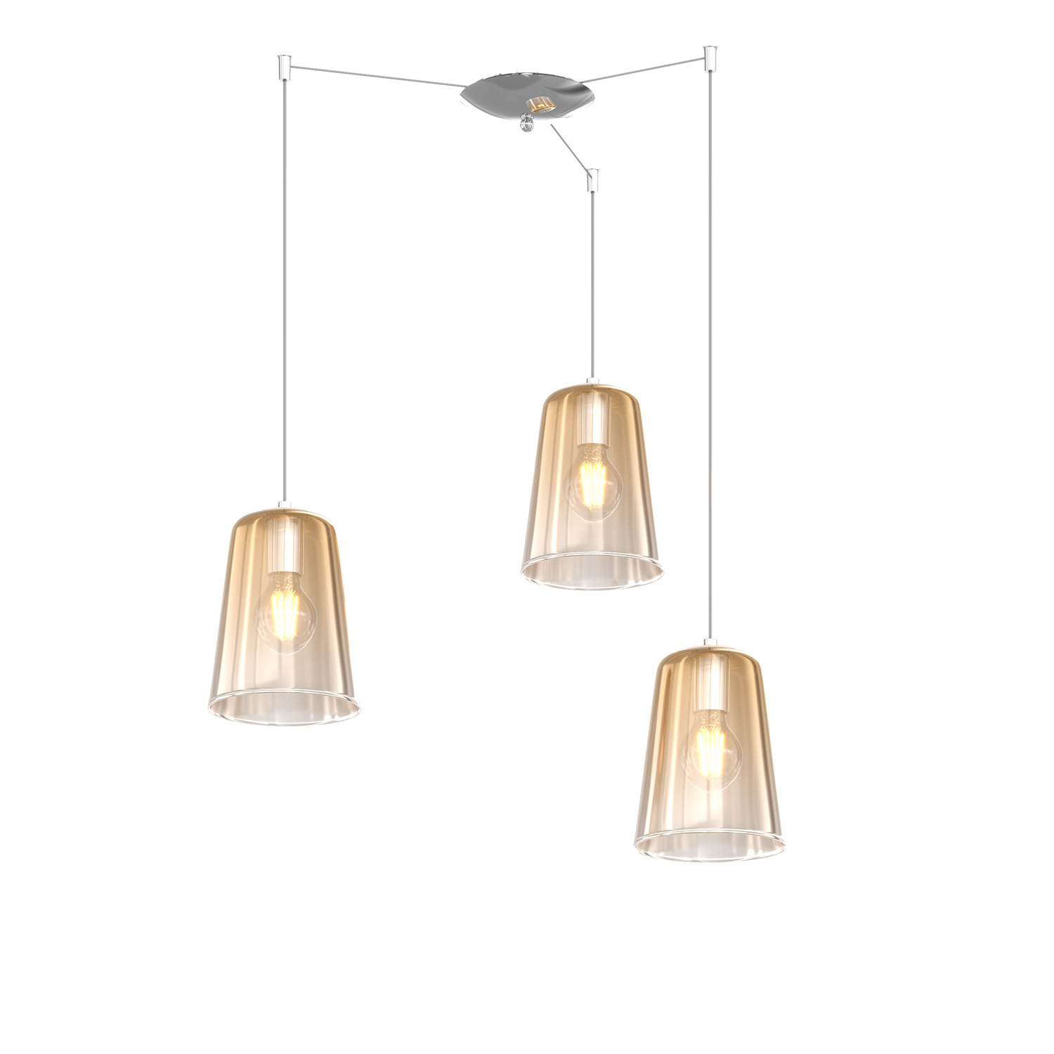 Collezione SHADEDIL CONNUBIO PERFETTO TRA ARTE E LUCESospensione 3 luci con struttura in metallo cromo e rosone tondo e con 3 coni in vetro pirex soffiato colore amb..