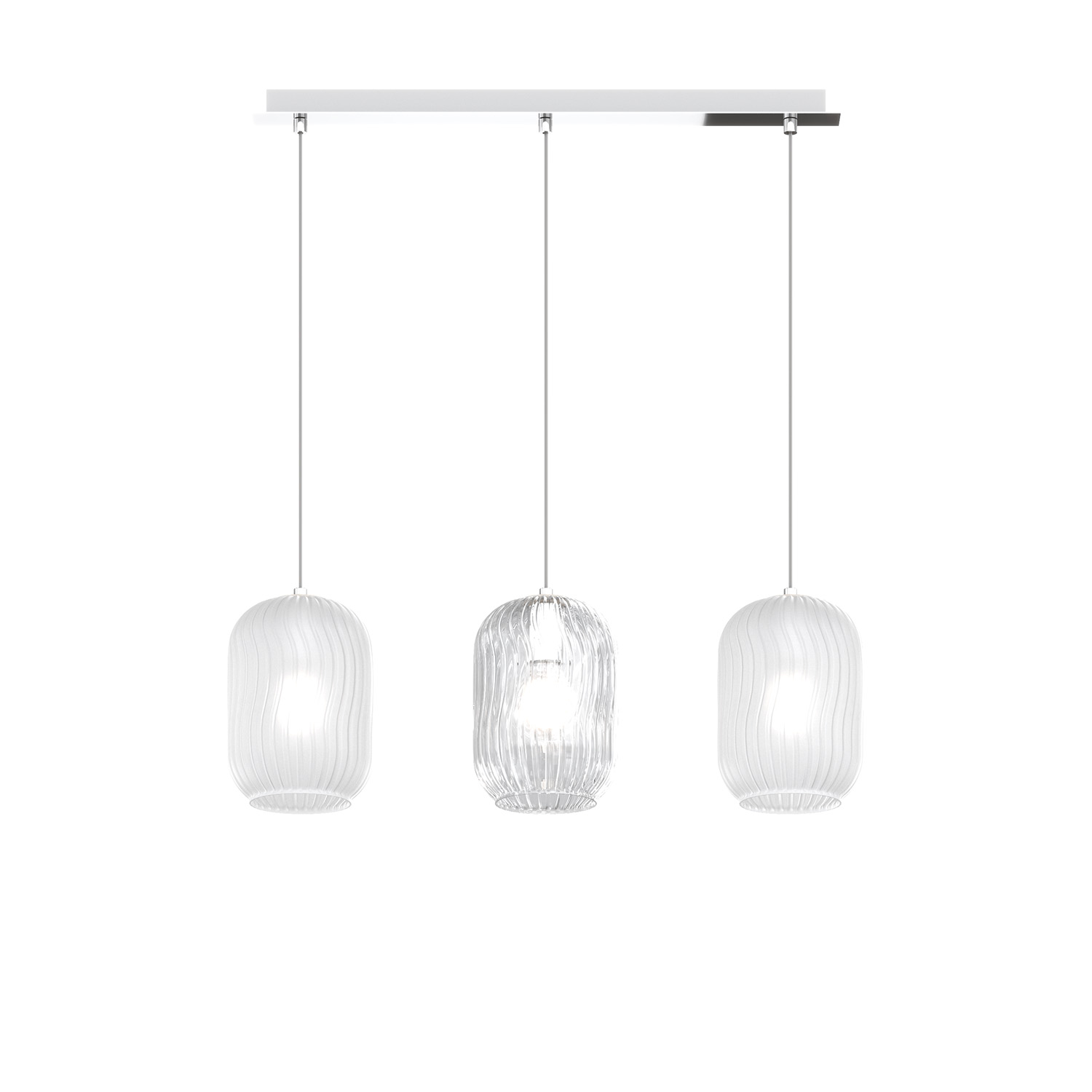 Sospensione 3 luci con cavo regolabile e struttura in metallo colore cromo. Come diffusore 3 vetri soffiati in finitura bianco e trasparente.. Le finiture dei vetri sono trasparente, bianco fog, ambra, verde, blu e fumè. Le strutture in metallo sono disponibili nelle finiture cromo, bianco e ottone satinato.Questo articolo è disponibile in diverse finiture e/o dimensioni. E' possibile indicarlo nell'apposito campo NOTE presente in conclusione di ordine oppure contattarci dopo aver effettuato l'ordine.