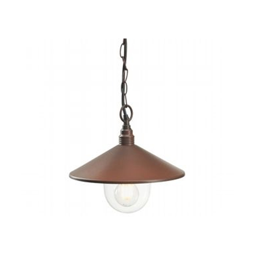 Sospensione per esterni a 1 luce realizzata con struttura in pressofusione di alluminio e luce rivolta verso basso.. Piatto in metallo verniciato color corten. Diffusore in vetro trasparente. La sospensione è dotata di cavo H05RN-F 3G1 e monta lampadina con altezza massima 105 mm (non inclusa). Disponibile anche nella variante bianca.
