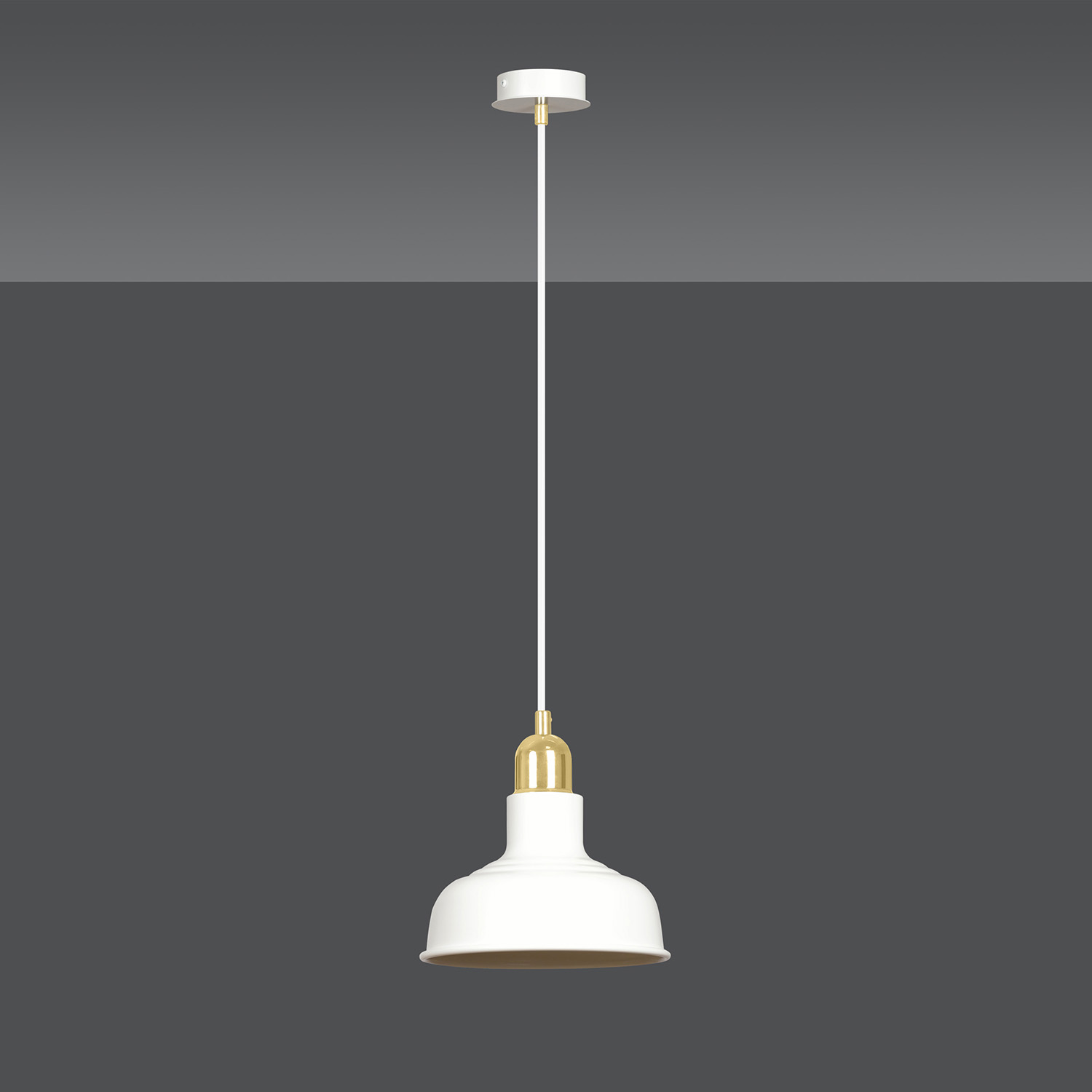 Sospensione in stile industriale realizzata con base rotonda in metallo e paralume in metallo di colore bianco con elementi decorativi dorati. Un modello che si adatta perfettamente a quasi tutti gli arredi interni. Il loro aspetto ricorda lo stile loft molto trendy. Le lampade IBOR sono caratterizzate da paralumi metallici aperti, che consentono alla lampada di illuminare efficacemente anche ampi spazi.