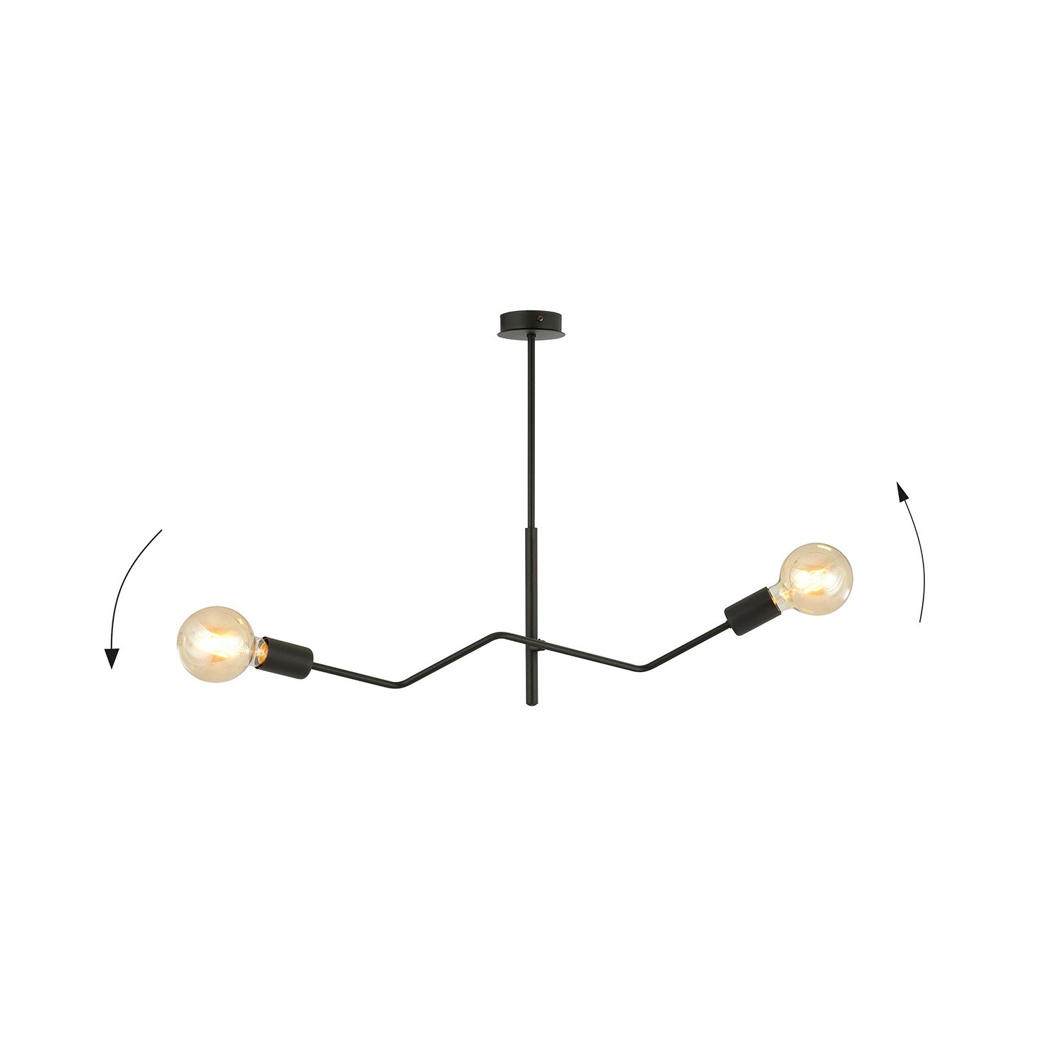 Sospensione realizzata con base in metallo di colore nero e bracci regolabili con due portalampada in metallo color nero su attacchi E27. . Questa lampada si adatta perfettamente alle tendenze minimaliste e affascina con la sua forma originale e il design unico. Aggiunge un carattere distintivo allo spazio e crea un'atmosfera unica. Il classico nero elegante offre molte possibilità di design e si fonde perfettamente con interni sia moderni che tradizionali.