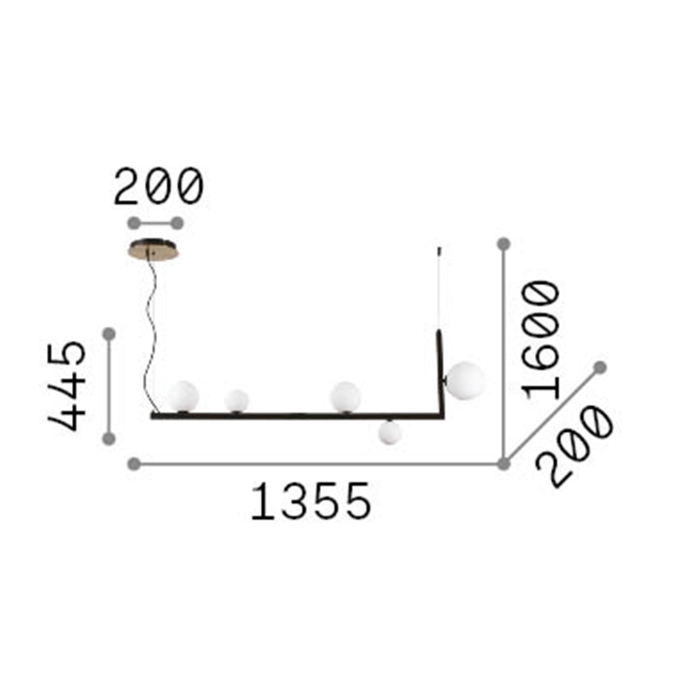 Sospensione lineare moderna a 5 luci con montatura in metallo verniciato nero opaco con disco decorativo in ottone satinato.. Diffusori in vetro soffiato bianco acidato. Monta lampadine LED G9 3W 3000 K incluse. Cavo in pvc con interruttore e spina.