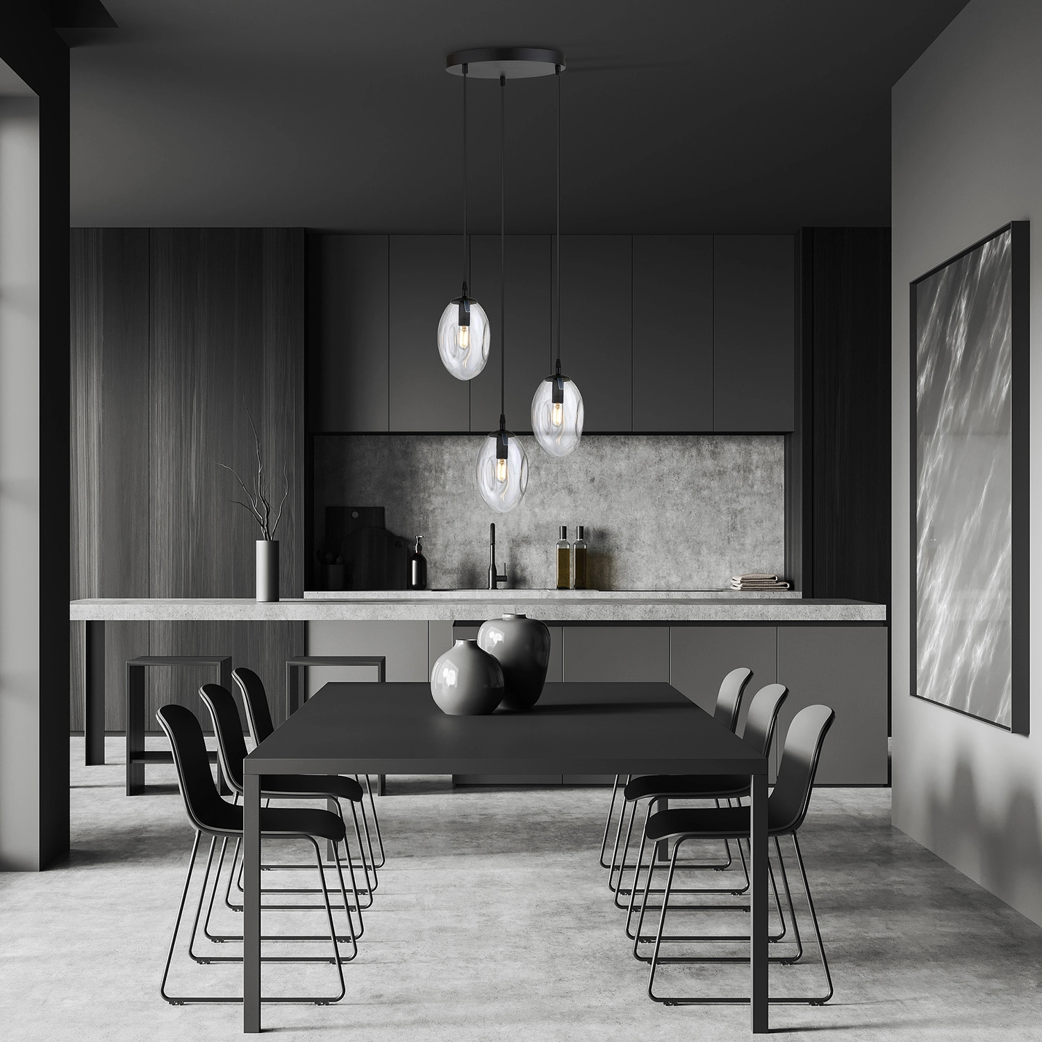 Sospensione minimal contemporanea, ad altezza regolabile, realizzata con base tonda in acciaio nero e 3 diffusori in vetro ovale incavato trasparente. Si integra perfettamente con vari interni, dallo stile moderno e minimalista a quello più classico.