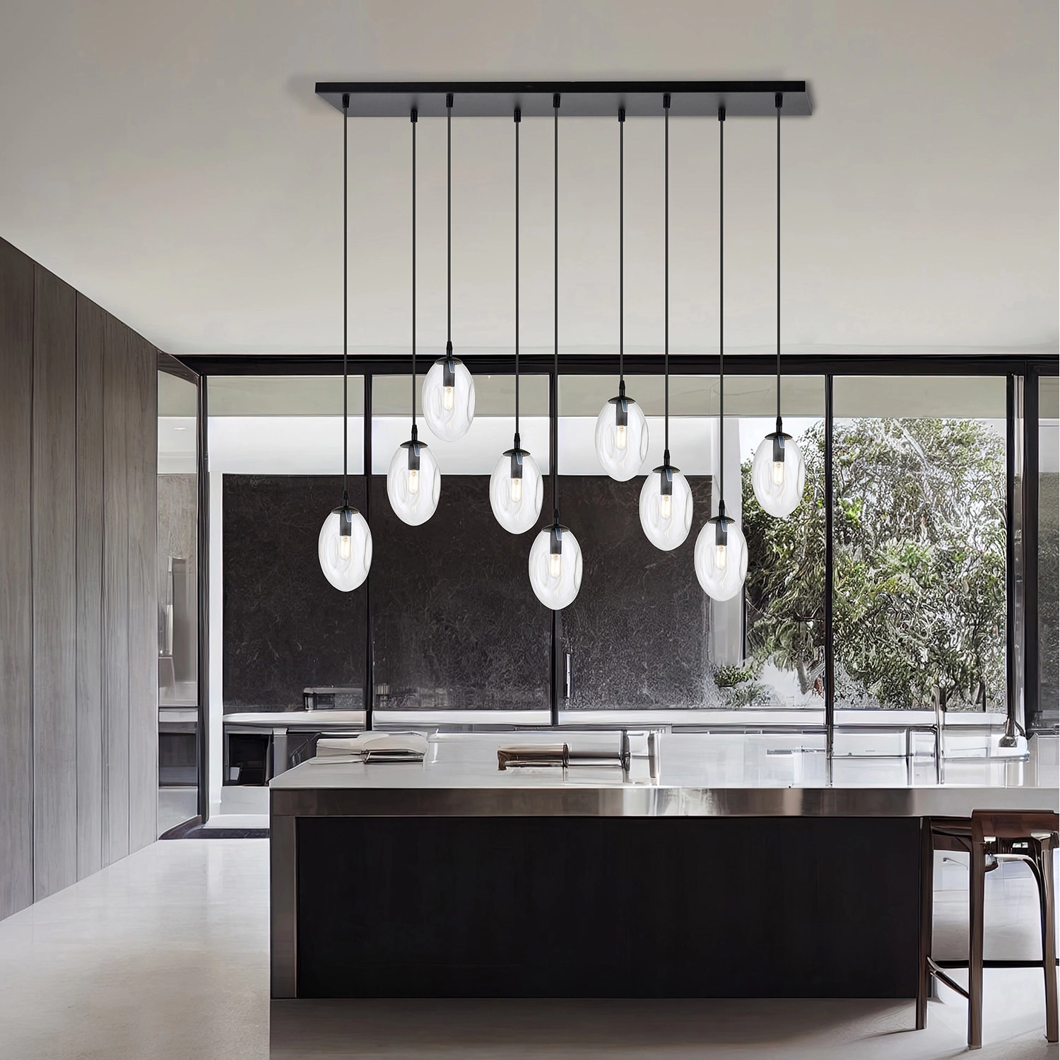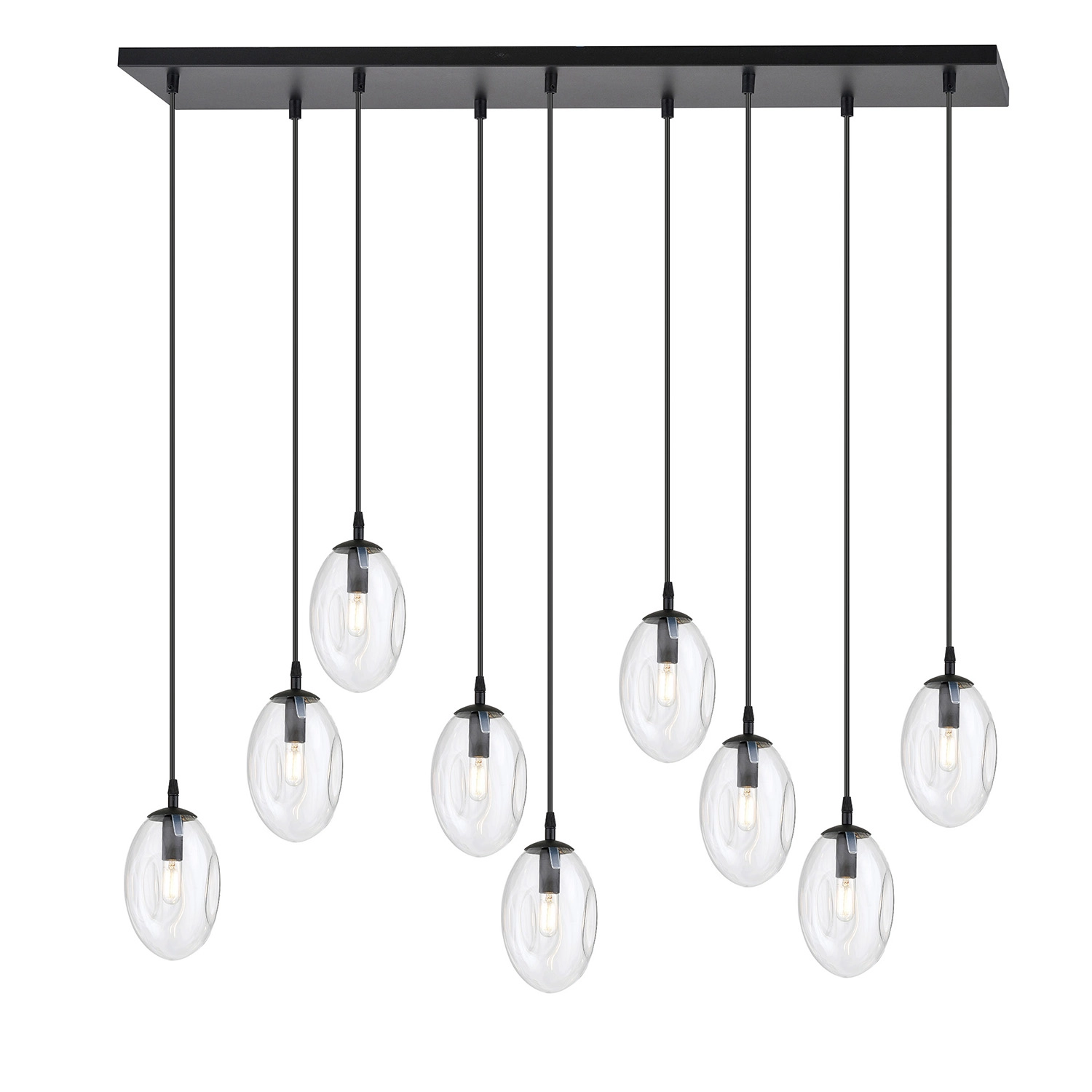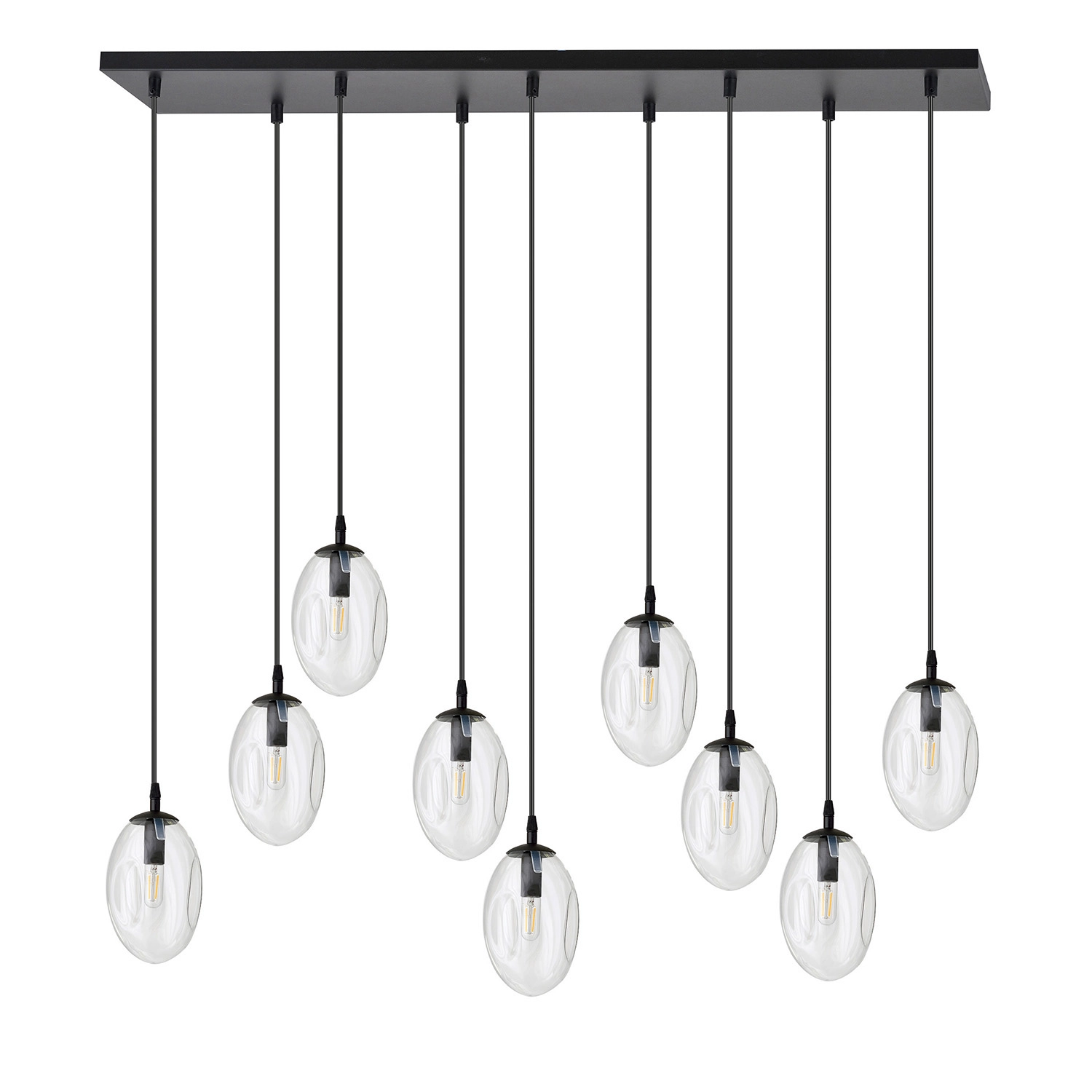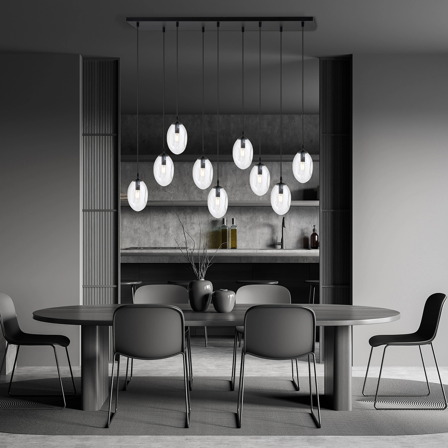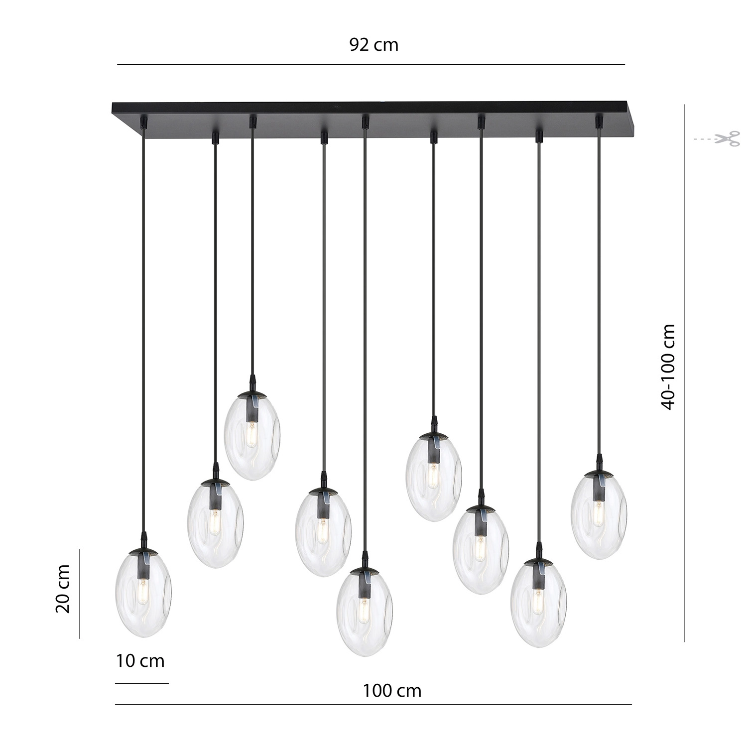 Sospensione minimal contemporanea, ad altezza regolabile, realizzata con base rettangolare in acciaio nero e 9 diffusori in vetro ovale incavato trasparente. Si integra perfettamente con vari interni, dallo stile moderno e minimalista a quello più classico.