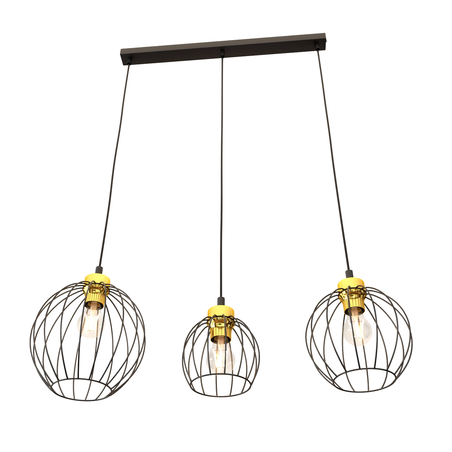 Sospensione 3 luci E27 in acciaio verniciato a polvere effetto gabbia con dettagli oro e altezza regolabile, con rosone lineare. La lampada a sospensione Hator è realizzata in solido acciaio, che le conferisce un carattere grezzo e industriale. I paralumi in filo metallico creano interessanti effetti luminosi, doHator originalità agli interni. È ideale per il soggiorno, la sala da pranzo e la cucina, portando in casa uno stile loft unico.