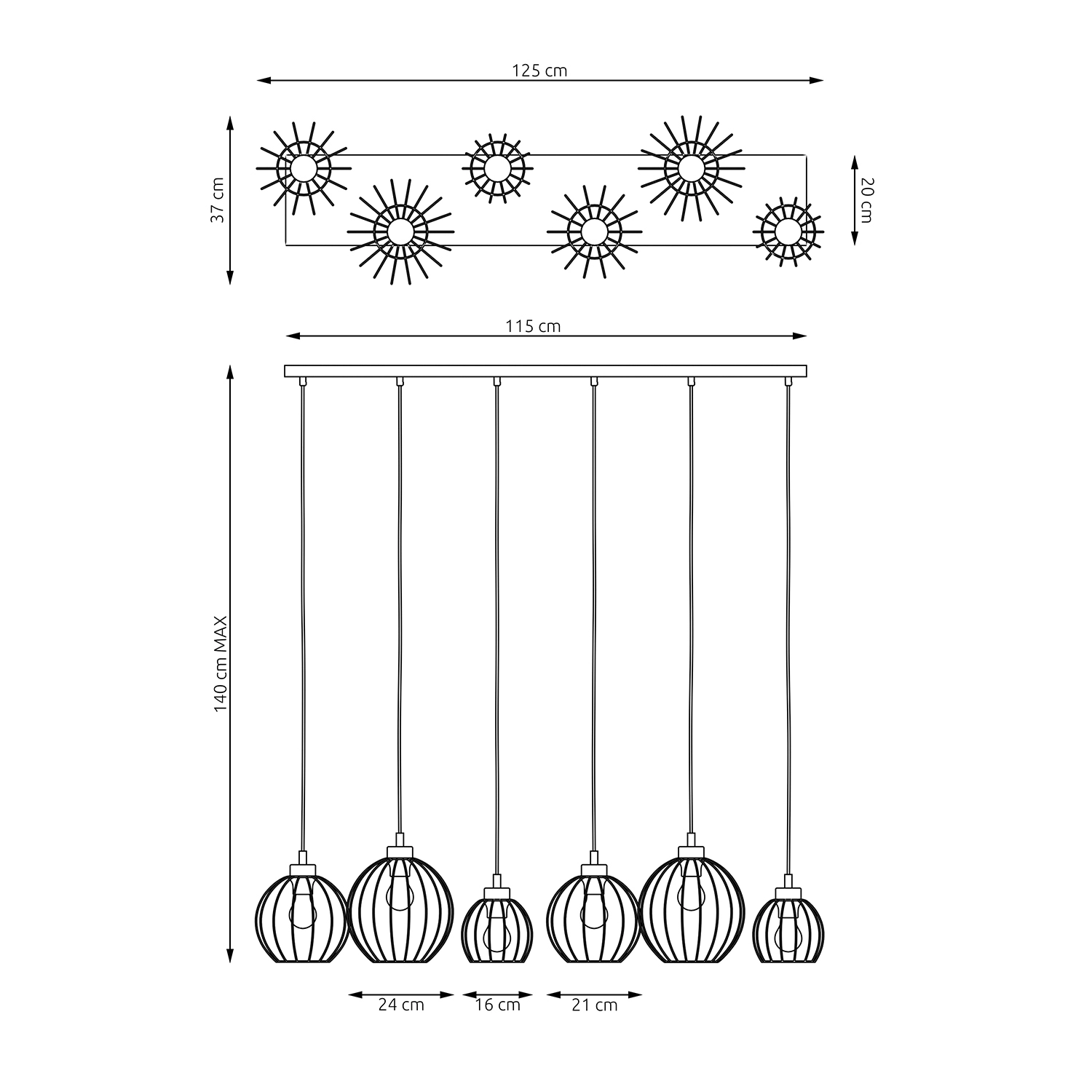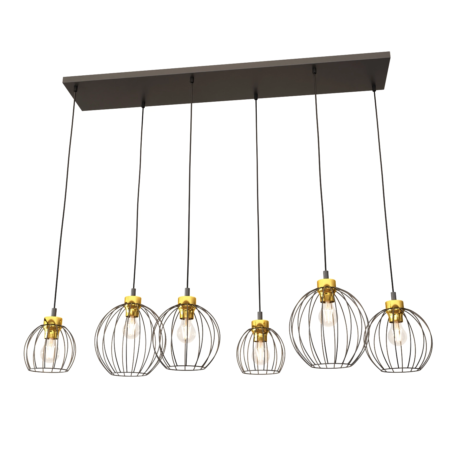 Sospensione 6 luci E27 in acciaio verniciato a polvere effetto gabbia con dettagli oro e altezza regolabile, con rosoone rettangolare. La lampada a sospensione Hator è realizzata in solido acciaio, che le conferisce un carattere grezzo e industriale. I paralumi in filo metallico creano interessanti effetti luminosi, doHator originalità agli interni. È ideale per il soggiorno, la sala da pranzo e la cucina, portando in casa uno stile loft unico.