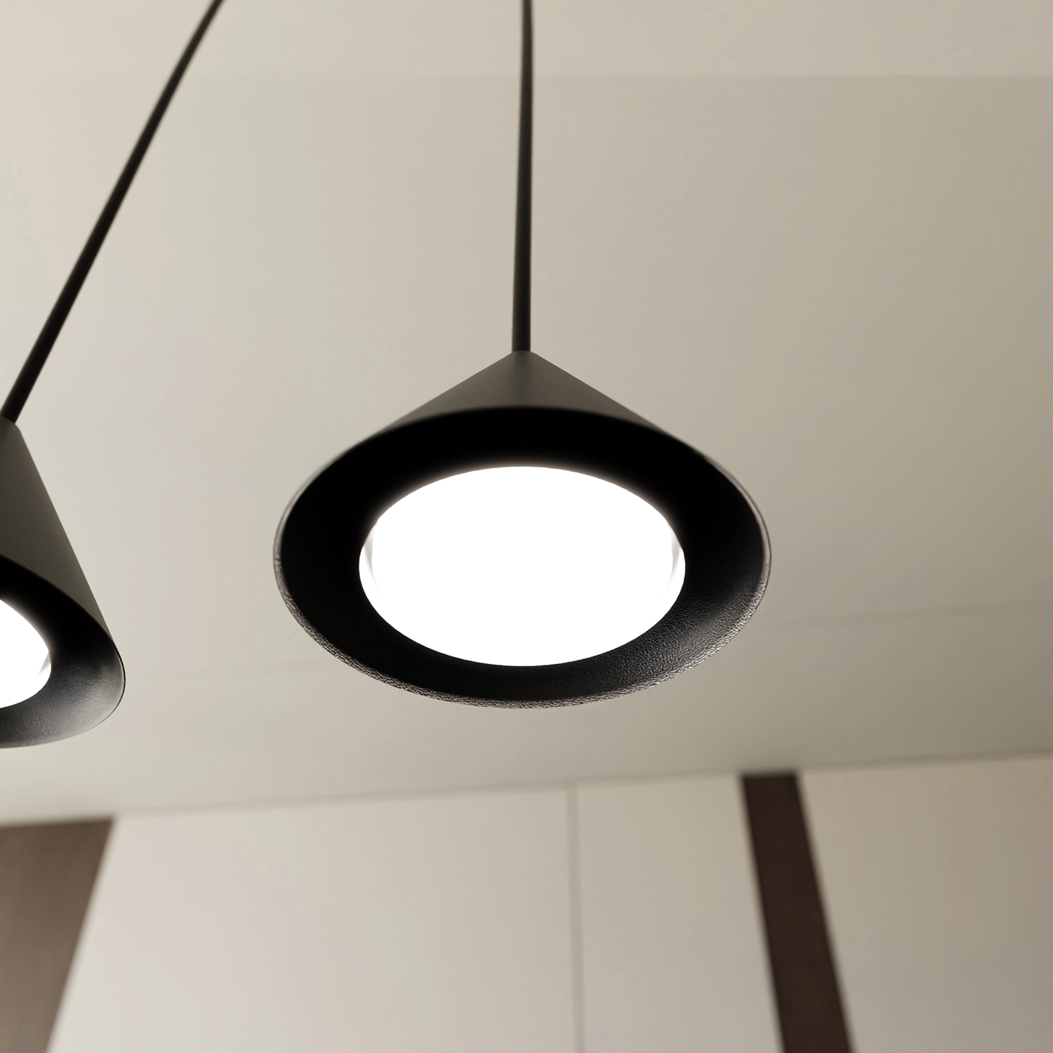 Collezione SkadiUNA LUCE CHE MERITA ATTENZIONESospensione moderna 3 luci, con rosone lineare, altezza regolabie e diffusori a forma di cono in acciaio nero. Le loro..