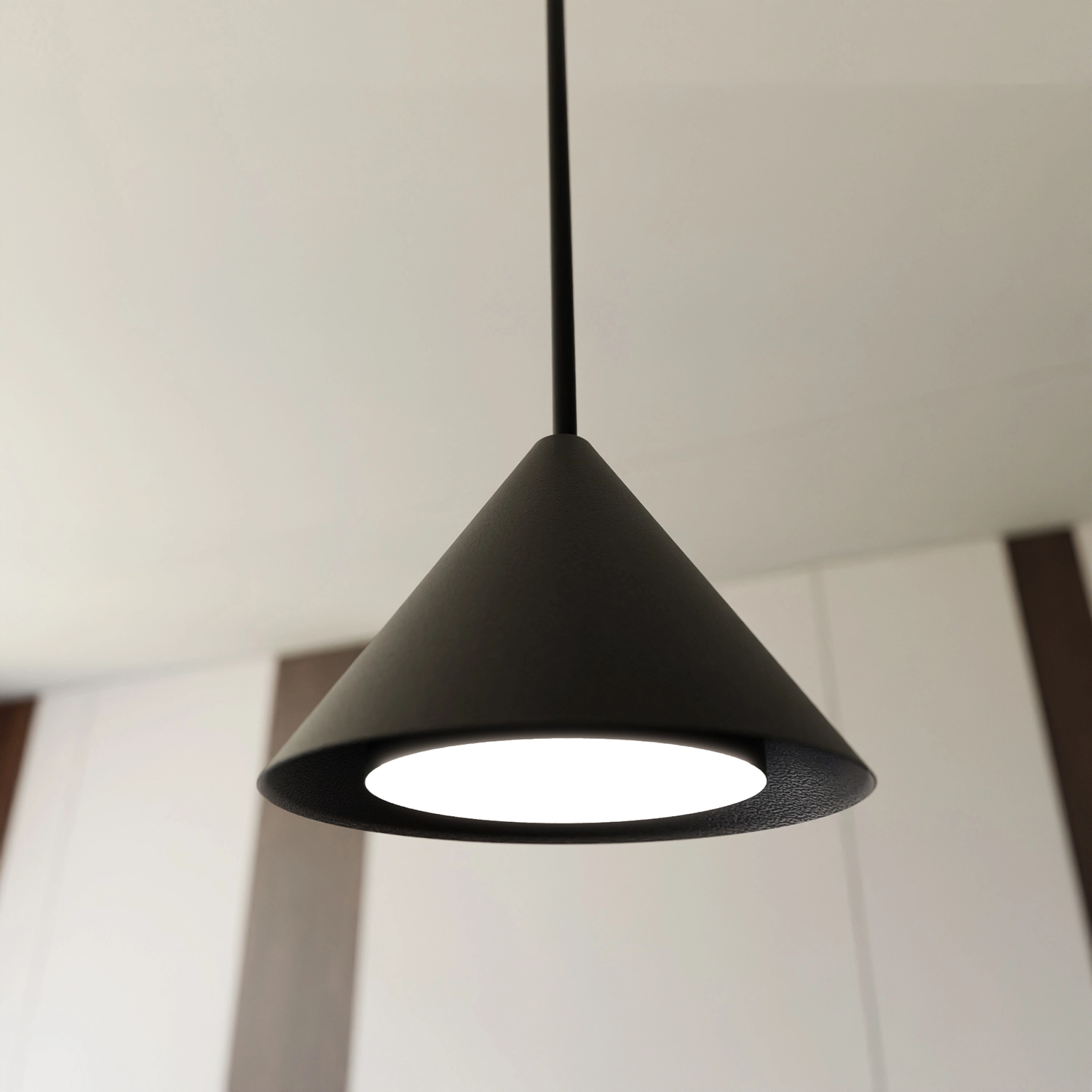 Collezione SkadiUNA LUCE CHE MERITA ATTENZIONESospensione moderna 1 luce, altezza regolabie e diffusore a forma di cono in acciaio nero. Le loro forme dorate a cono..