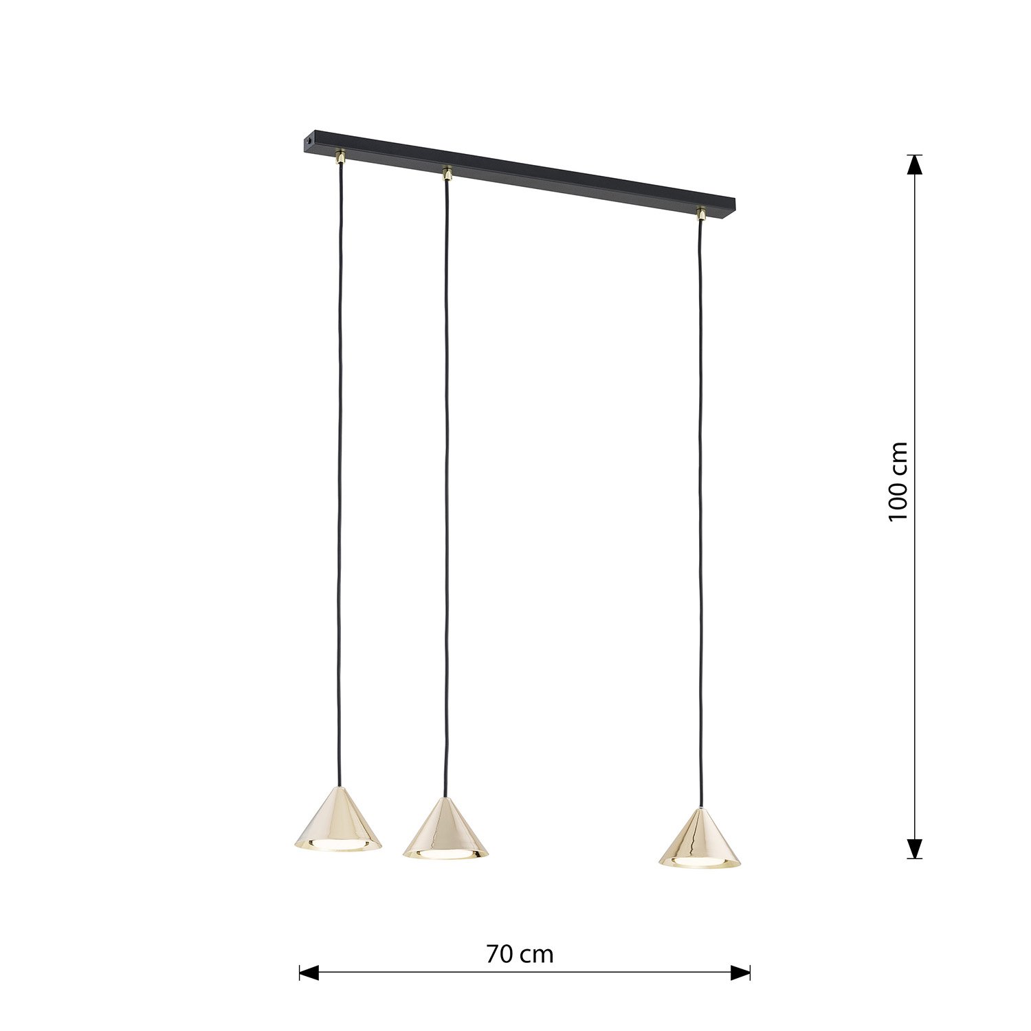 Sospensione moderna 3 luci, con rosone lineare, altezza regolabie e diffusori a forma di cono in acciaio Oro. Le loro forme di cono conferiscono loro un carattere minimalista, adattandosi perfettamente alle tendenze dell'interior design. Queste lampade a sospensione non solo illuminano lo spazio ma fungono anche da elemento di design, aggiungendo un accento lussuoso. Il design universale li fa fondere perfettamente con vari stili di interni, conferendo un carattere unico. Skadi è la perfetta combinazione tra funzionalità ed estetica che mette in risalto il carattere distintivo di ogni ambiente.