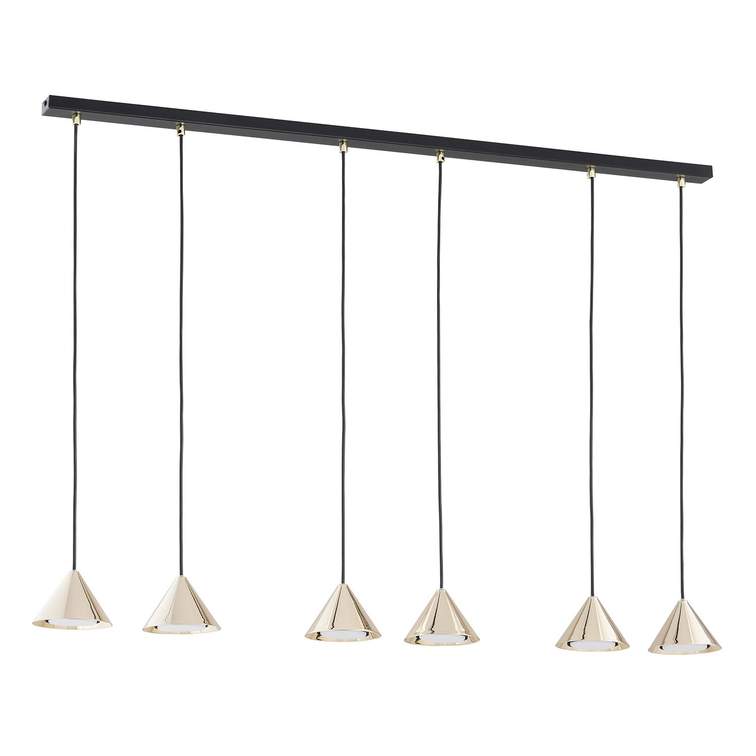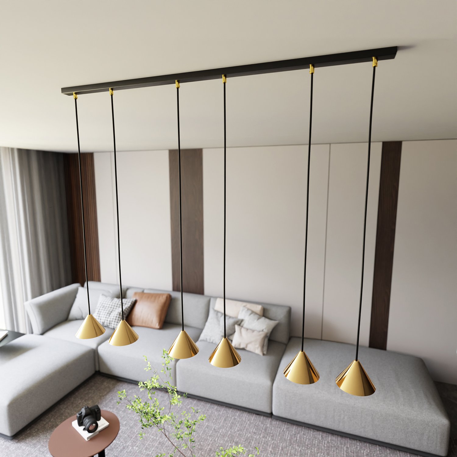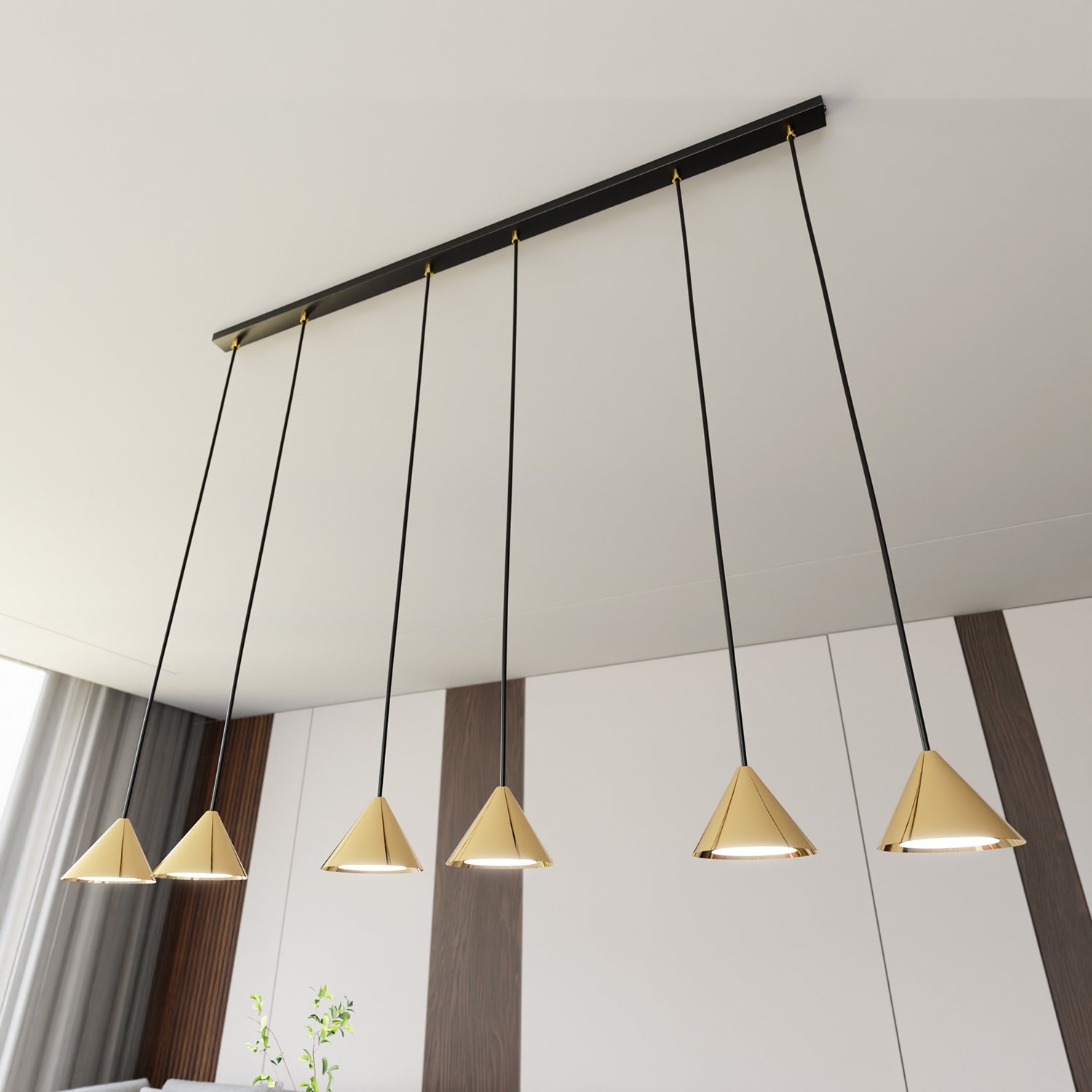 Sospensione moderna 6 luci, con rosone lineare, altezza regolabie e diffusori a forma di cono in acciaio oro. Le loro forme di cono conferiscono loro un carattere minimalista, adattandosi perfettamente alle tendenze dell'interior design. Queste lampade a sospensione non solo illuminano lo spazio ma fungono anche da elemento di design, aggiungendo un accento lussuoso. Il design universale li fa fondere perfettamente con vari stili di interni, conferendo un carattere unico. Skadi è la perfetta combinazione tra funzionalità ed estetica che mette in risalto il carattere distintivo di ogni ambiente.