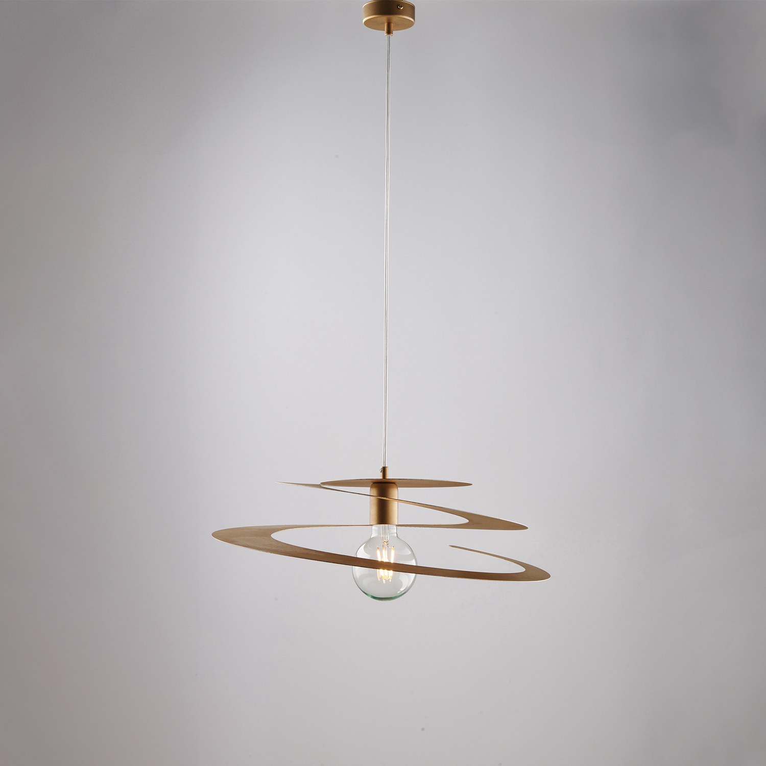 Sospensione a 1 luce con diffusore in ferro laccato oro, con cavo elettrico regolabile. . La struttura aperta con lampada a vista, permette una diffusione uniforme della luce, creando un ambiente caldo e invitante. Il cavo regolabile in altezza permette di adattare la sospensione alla configurazione specifica della stanza. La spirale non solo aggiunge un tocco estetico, ma facilita anche l'aggiustamento della lunghezza. Disponibile in diverse finiture, queste lampade possono facilmente integrarsi in vari contesti, dalle cucine ai soggiorni, aggiungendo sempre un tocco di stile e carattere distintivo.