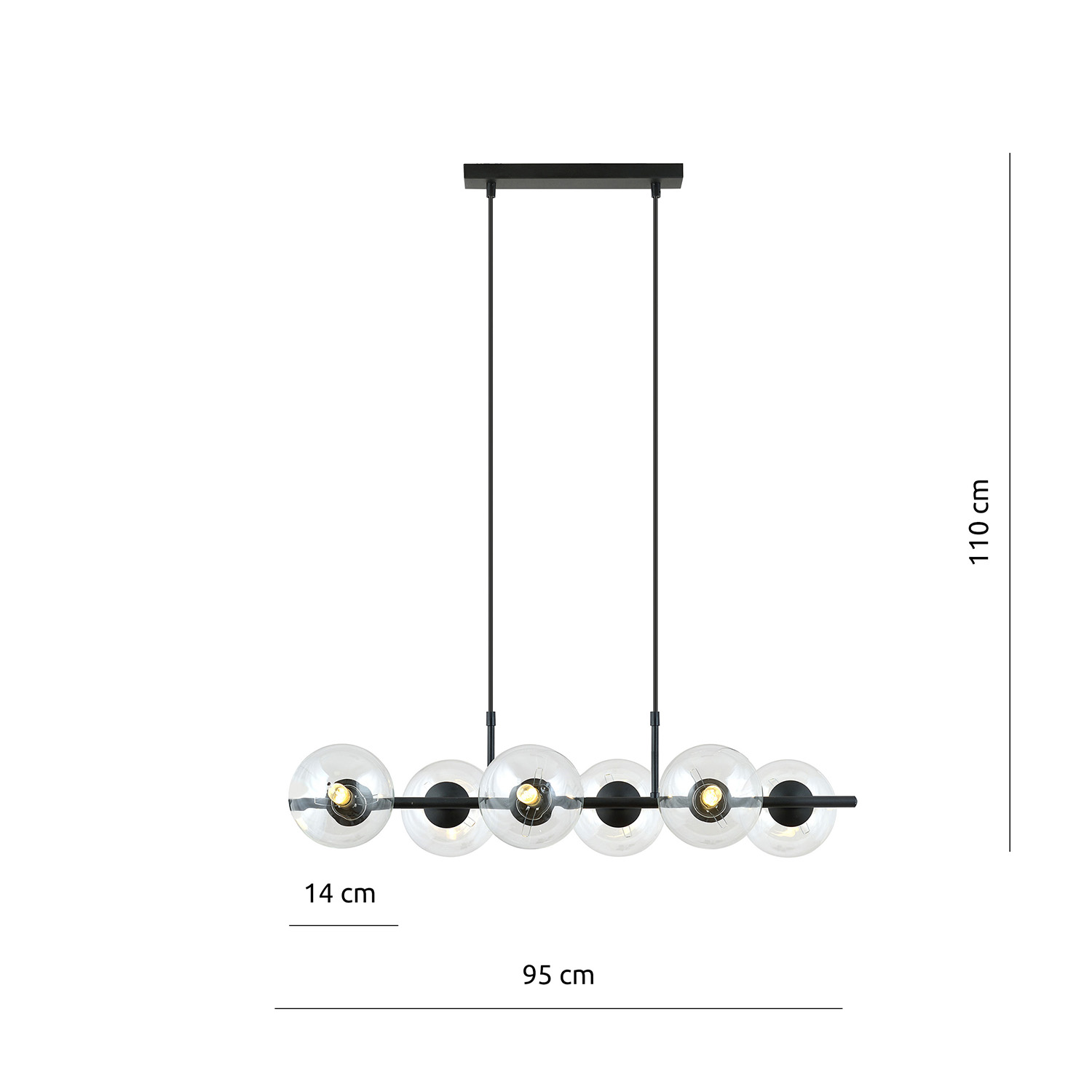 Sospensione moderna realizzata con una base rettangolare in metallo nero e un braccio in metallo sospeso con sei paralumi sferici in vetro trasparente. Il suo design di tendenza e i leggeri paralumi in vetro la rendono una decorazione elegante, illuminando efficacemente anche ampi spazi. Posizionato sopra un tavolo o un'isola della cucina, crea un punto focale sorprendente e conferisce un carattere unico agli interni. La sua forma si armonizza perfettamente con linee pulite e spazi aperti.
