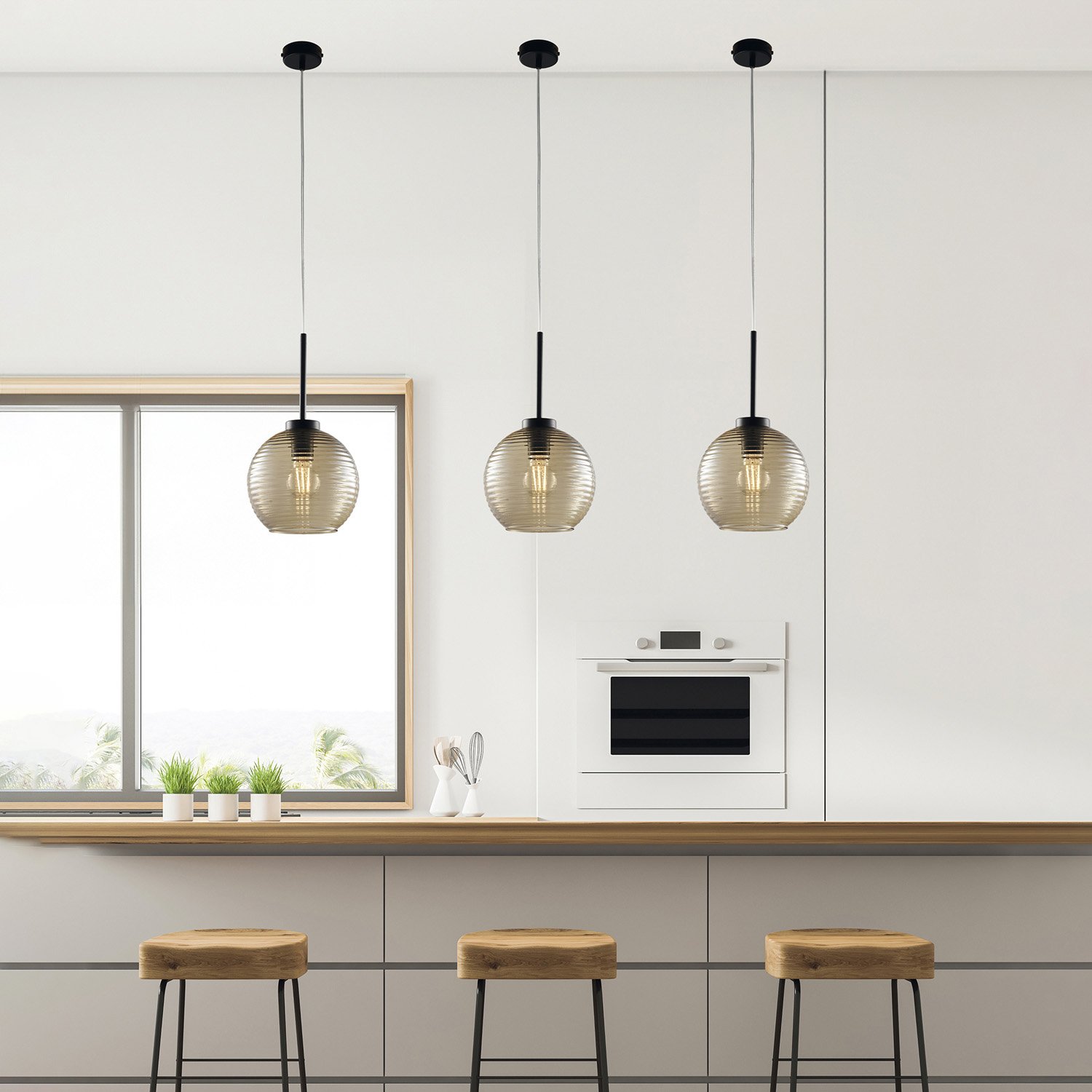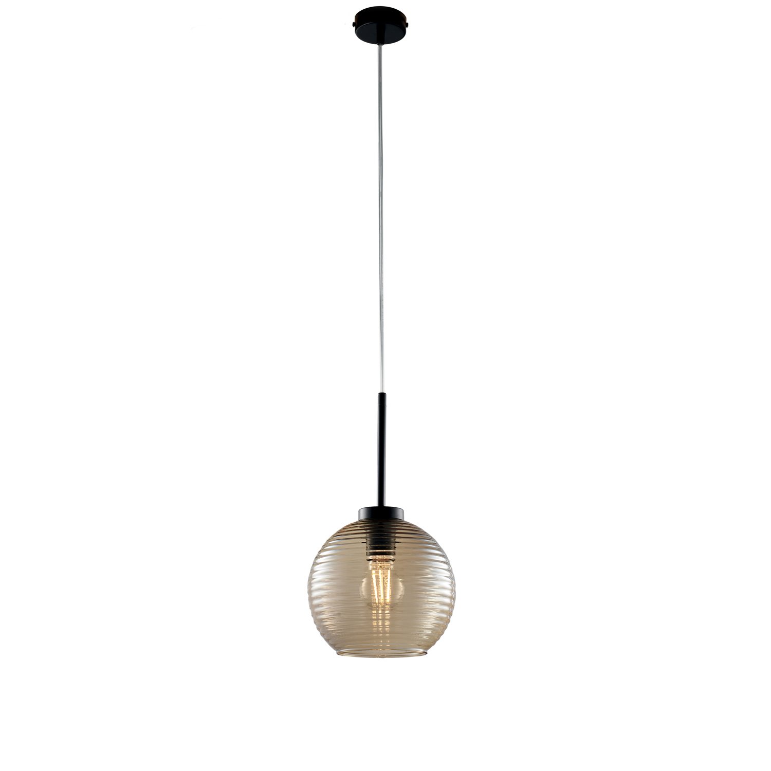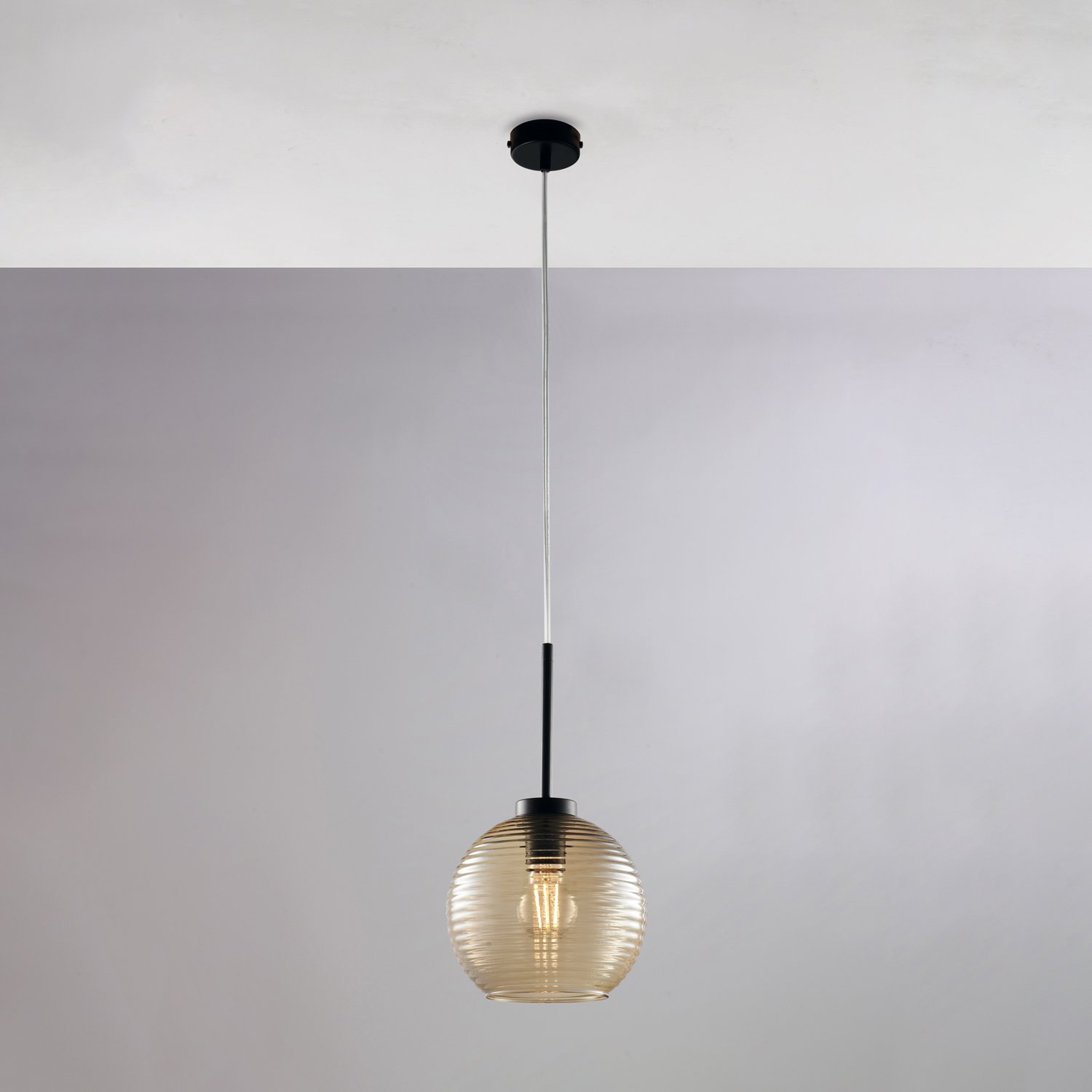 Sospensione ad una luce in ferro laccato nero con cavo elettrico regolabile. Diffusore in vetro soffiato ambra con rigatura in rilievo.. Perfetta per illuminare aree focali come tavoli da pranzo, isole da cucina o angoli salotto. Il design elegante e versatile si adatta a una varietà di stili di arredamento, dal contemporaneo al moderno, aggiungendo un tocco di eleganza ovunque sia collocata.