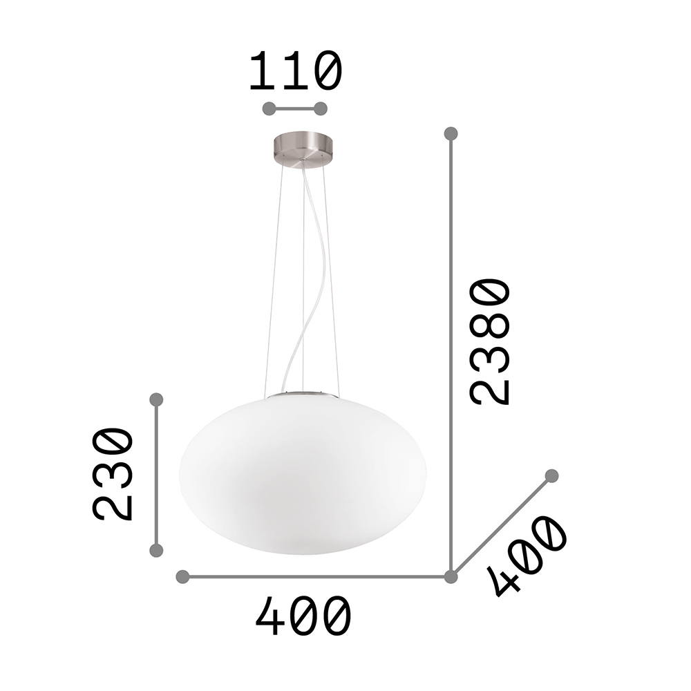 Sospensione moderna a 1 luce con montatura in metallo con finitura nickel satinato.. Diffusore in vetro bianco soffiato e acidato. Cavi in acciaio a lunghezza regolabile con dispositivi ferma cavoautomatici. Disponibile in tre diverse misure.