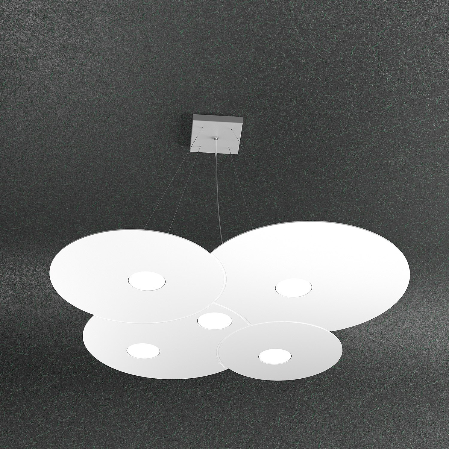 Sospensione di finitura bianca con lastre quadrate di metallo con lavorazioni di fresatura che creano giochi di cerchi sovrapposti.. Il punto di forza del prodotto consiste nel non utilizzare dei led integrati ma una lampadina Gx53 che, una volta montata, arriva a filo della lastra metallica e può essere facilmente sostituita dall’esterno. Disponibile anche nella versione sospensione 5 luci più 2 luci.Questo articolo è disponibile in diverse finiture e/o dimensioni. E' possibile indicarlo nell'apposito campo NOTE presente in conclusione di ordine oppure contattarci dopo aver effettuato l'ordine.