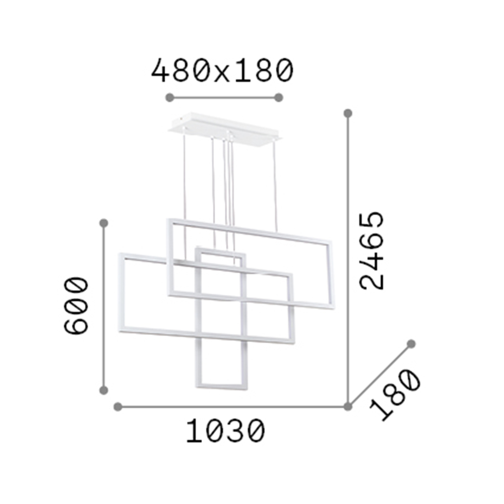 Sospensione che riproduce 3 rettangoli che si incrociano con base e montatura in metallo verniciato bianco opaco. Diffusori in materiale plastico colore opale.. Cavi regolabili in lunghezza. Emissione luce diretta 3000 K (tono caldo) Led 93 W.