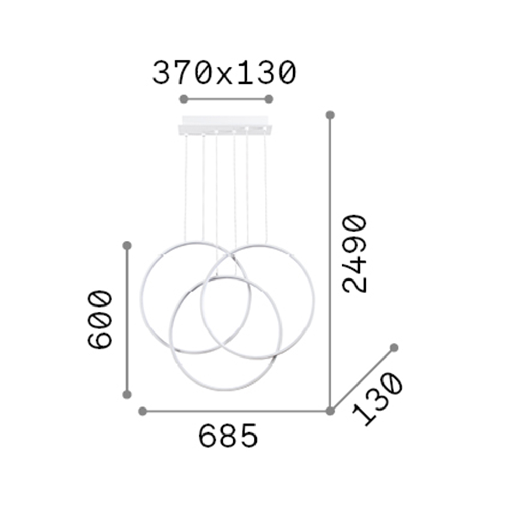 Sospensione che riproduce 3 cerchi che si incrociano con base e montatura in metallo verniciato bianco opaco. Diffusori in materiale plastico colore opale.. Cavi regolabili in lunghezza. Emissione luce diretta tonalità calda 3000 K Led 82 W.