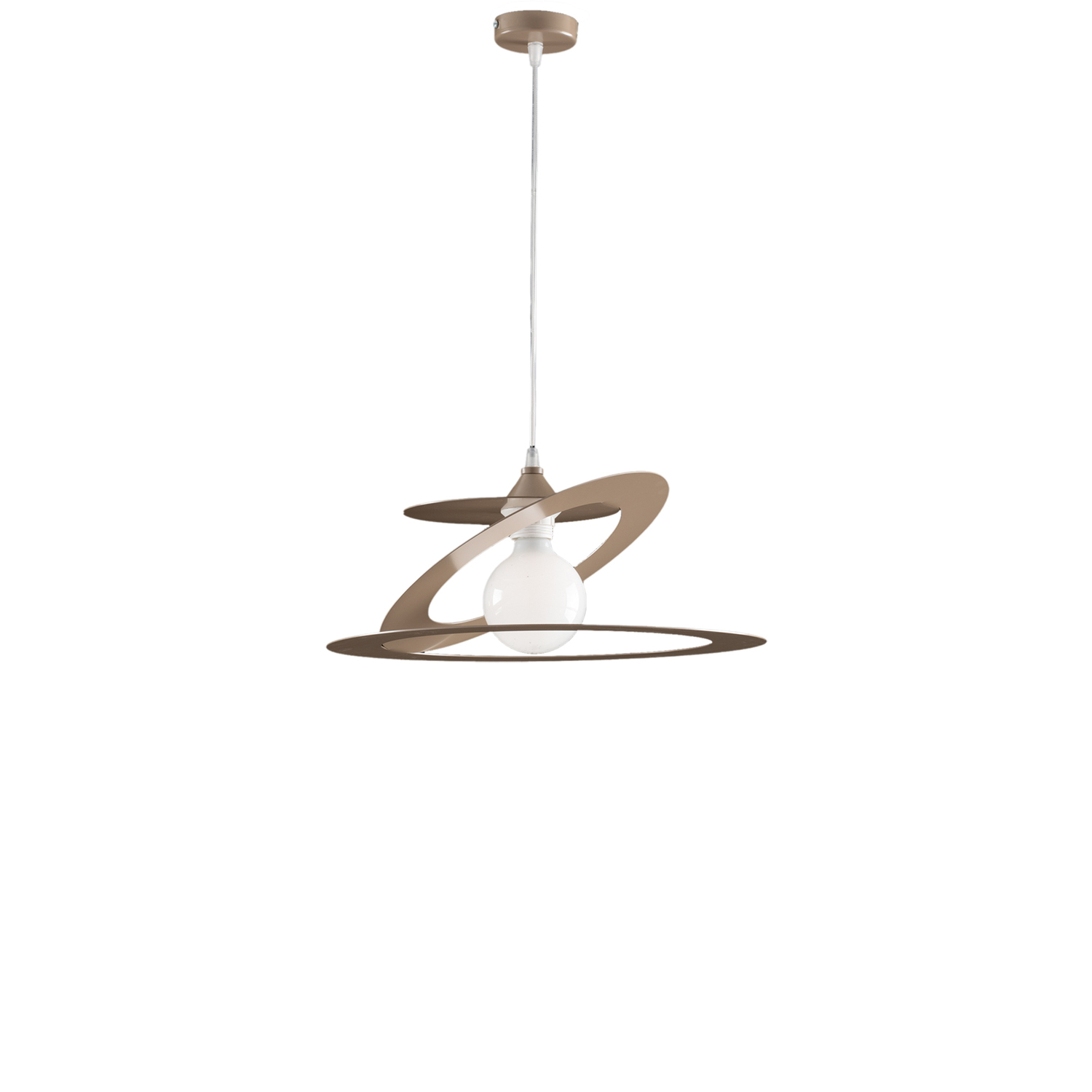 Sospensione moderna 1 luce con diffusore in ferro laccato tortora dalla forma astratta grazie al taglio laser.. Rosone in tinta e cavetto bianco per regolarne l'altezza. Un complemento d'arredo sicuramente unico nel suo genere. Disponibile anche in bianco e grigio.