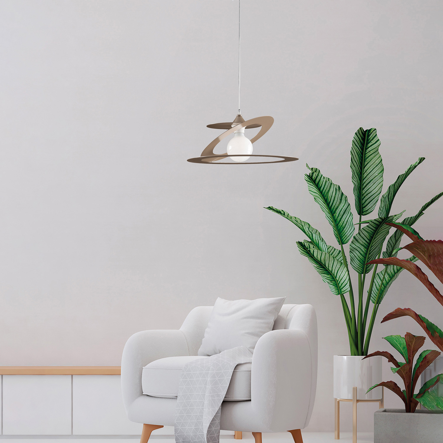 Collezione GekoFORME ASTRATTE PER CHI AMA OSARESospensione moderna 1 luce con diffusore in ferro laccato tortora dalla forma astratta grazie al taglio laser.. Rosone..