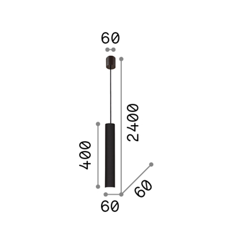 Sospensione con rosone e diffusore cilindrico h.40 cm diam.6 cm in metallo con varie finiture. Cavo in tessuto regolabile in lunghezza.. Sorgente Led GU10 monta lampadine sostituibili max 28 W. Modello con finitura ottone satinato con diffusore in vetro.