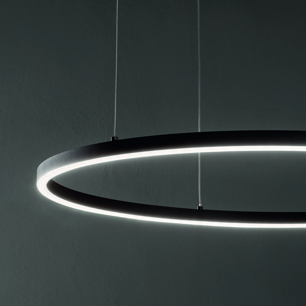 Collezione ORACLEFORME SLIM E CONTEMPORANEESospensione costituita da una montatura sottile in alluminio verniciato nero opaco e diffusore opale in policarbonato.. Qu..