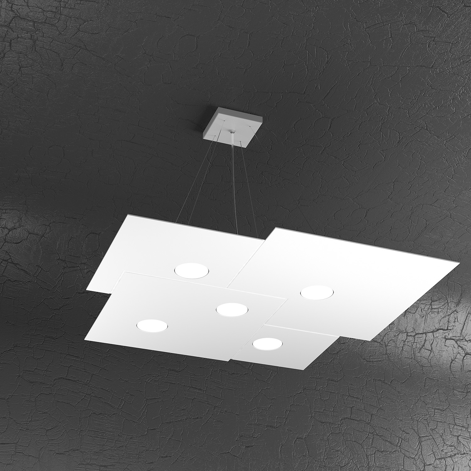 Sospensione di finitura bianca realizzata con lastre quadrate di metallo con lavorazioni di fresatura che creano giochi di quadrati sovrapposti.. Il punto di forza del prodotto consiste nel non utilizzare dei led integrati ma una lampadina Gx53 che, una volta montata, arriva a filo della lastra metallica e può essere facilmente sostituita dall’esterno. Disponibile anche nella versione sospensione 5 luci più 2 luci.Questo articolo è disponibile in diverse finiture e/o dimensioni. E' possibile indicarlo nell'apposito campo NOTE presente in conclusione di ordine oppure contattarci dopo aver effettuato l'ordine.