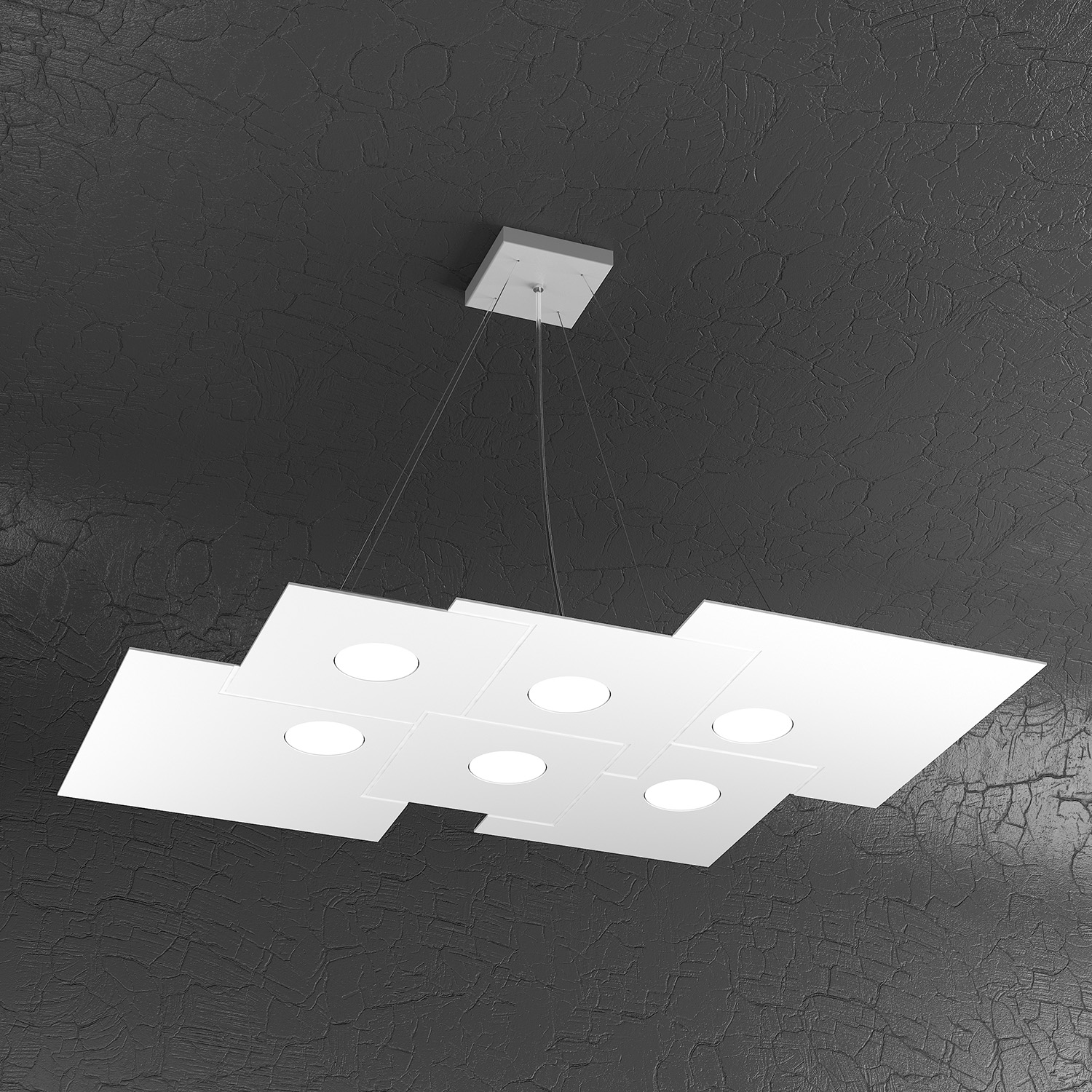 Sospensione di finitura bianca realizzata con lastre quadrate di metallo con lavorazioni di fresatura che creano giochi di quadrati sovrapposti.. Il punto di forza del prodotto consiste nel non utilizzare dei led integrati ma una lampadina Gx53 che, una volta montata, arriva a filo della lastra metallica e può essere facilmente sostituita dall’esterno. Disponibile anche nella versione sospensione 6 luci più 2 luci.Questo articolo è disponibile in diverse finiture e/o dimensioni. E' possibile indicarlo nell'apposito campo NOTE presente in conclusione di ordine oppure contattarci dopo aver effettuato l'ordine.