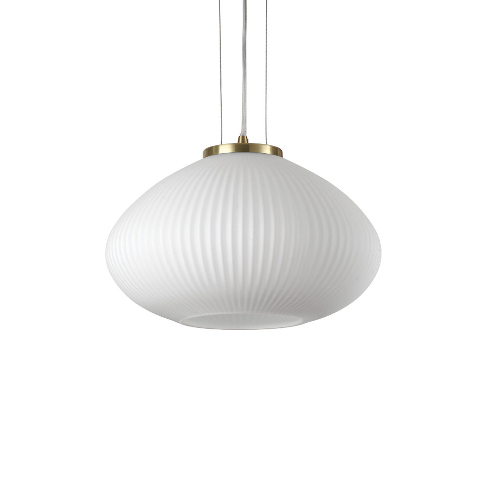 Sospensione moderna con montatura in metallo placcato ottone satinato. Diffusore in vetro soffiato bianco, con decoro in rilievo.. Cavo elettrico in pvc trasparente. Il diffusore è in acrilico trasparente. Disponibile anche nella finitura nero con cover posteriore e ghiera frontale.Disponibile in diverse misure e nella versione ottone satinato. Una linea di lampadari moderni.