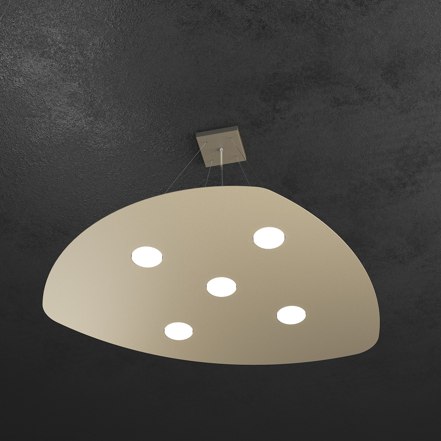 Sospensione 5 luci realizzata con lastre quadrate di metallo dalle forme morbide ed irregolari verniciata in finiture sabbia.. Il punto di forza del prodotto consiste nel non utilizzare dei led integrati ma una lampadina Gx53 che, una volta montata, arriva a filo della lastra metallica e può essere facilmente sostituita dall’esterno. Disponibile anche nella versione sospensione con 2 luci disposte sul lato superiore della piastra per illuminare il soffitto, in modo da uniformare la luminositàQuesto articolo è disponibile in diverse finiture e/o dimensioni. E' possibile indicarlo nell'apposito campo NOTE presente in conclusione di ordine oppure contattarci dopo aver effettuato l'ordine.