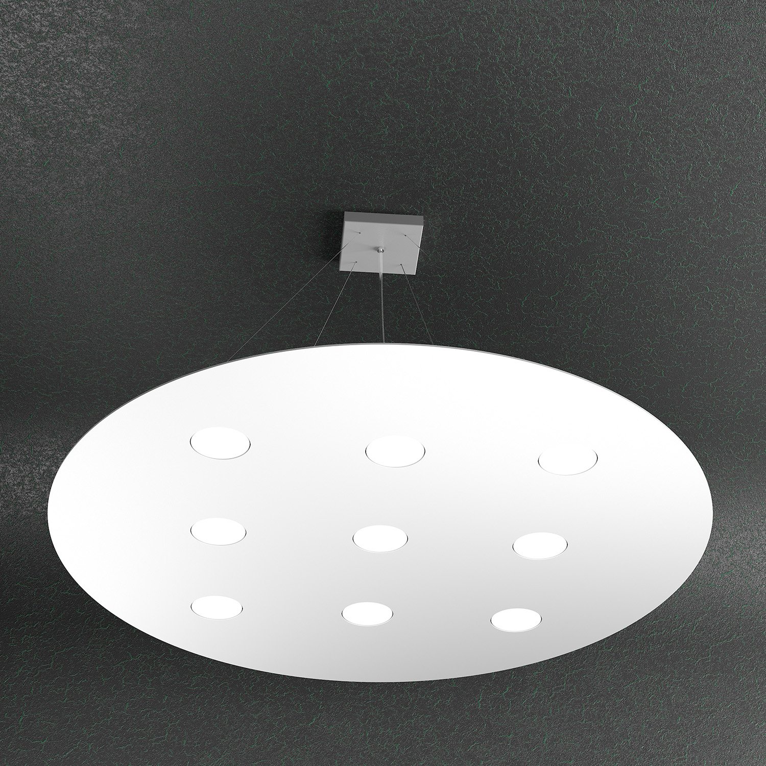 Sospensione di finitura bianca con struttura in metallo.. Il punto di forza del prodotto consiste nel non utilizzare dei led integrati ma una lampadina Gx53 che, una volta montata, arriva a filo della lastra metallica e può essere facilmente sostituita dall’esterno. Disponibile anche nella versione sospensione 9 luci più 4 luci.Questo articolo è disponibile in diverse finiture e/o dimensioni. E' possibile indicarlo nell'apposito campo NOTE presente in conclusione di ordine oppure contattarci dopo aver effettuato l'ordine.