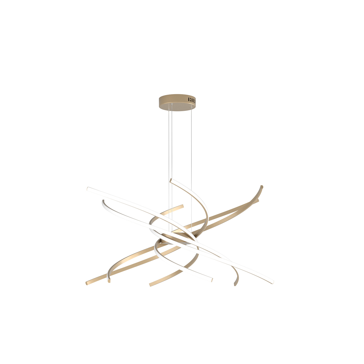 Sospensione con profili curvi in alluminio di colore oro, che creano un movimento circolare ampio ed allo stesso tempo essenziale.. Le sospensioni danno la possibilità di sostituire le singole sorgenti luminose senza necessità di sostituire l'intero prodotto e sono disponibili con led a luce calda (3000°K). Le sospensioni sono regolabili in altezza.Questo articolo è disponibile in diverse finiture e/o dimensioni. E' possibile indicarlo nell'apposito campo NOTE presente in conclusione di ordine oppure contattarci dopo aver effettuato l'ordine.