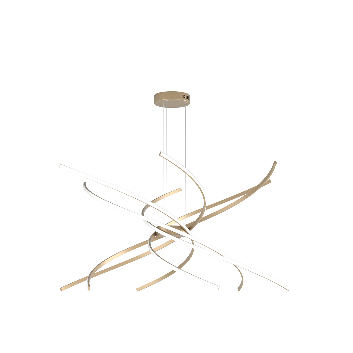 Sospensione con profili curvi in alluminio di colore oro, che creano un movimento circolare ampio ed allo stesso tempo essenziale.. Le sospensioni danno la possibilità di sostituire le singole sorgenti luminose senza necessità di sostituire l'intero prodotto e sono disponibili con led a luce calda (3000°K). Le sospensioni sono regolabili in altezza.Questo articolo è disponibile in diverse finiture e/o dimensioni. E' possibile indicarlo nell'apposito campo NOTE presente in conclusione di ordine oppure contattarci dopo aver effettuato l'ordine.
