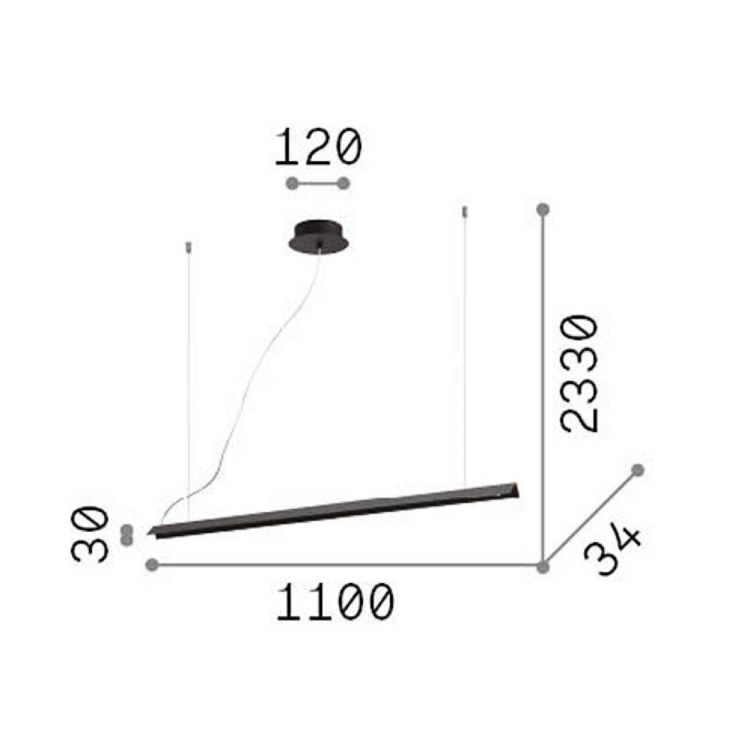 Sospensione lineare moderna con corpo luce in allumino verniciato a polveri nero e diffusore in silicone opale.. Cavi di acciaio con supporti cromati e cavo elettrico in pvc. Led integrato 25 watt 3000K (luce calda) con 20,000 ore di durata.