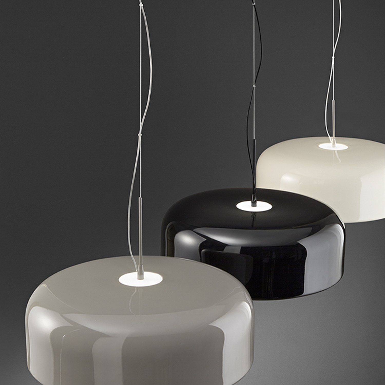 Collezione VeliaCollezione con struttura in metallo e allumino verniciato a polvere con finitura lucida. Diffusori in acrilico satinato bianco. Cavo supporto acciaio..