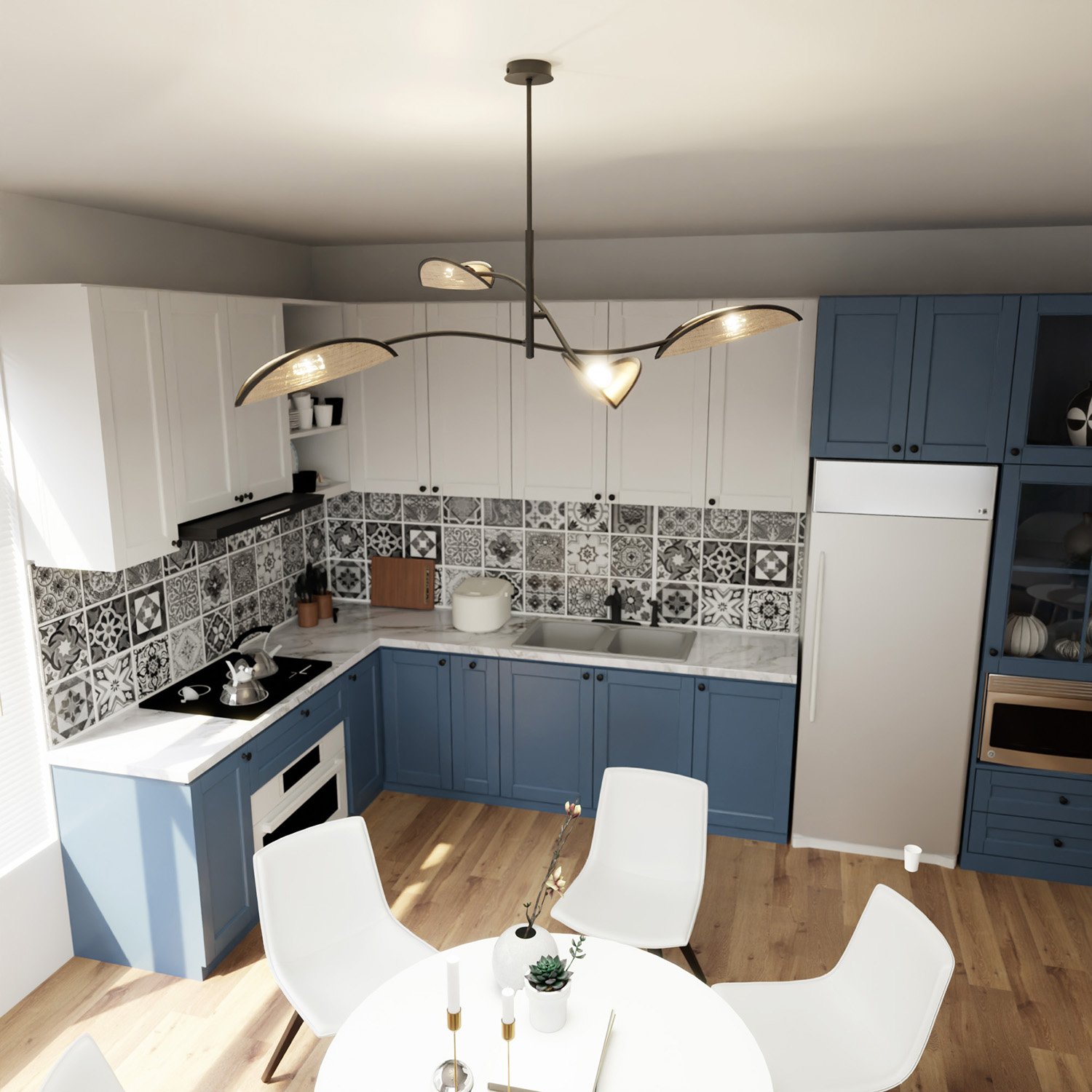 Sospensione nordica 4 luci Ares in acciaio e rattan con bracci regolabili emibig 1108/4