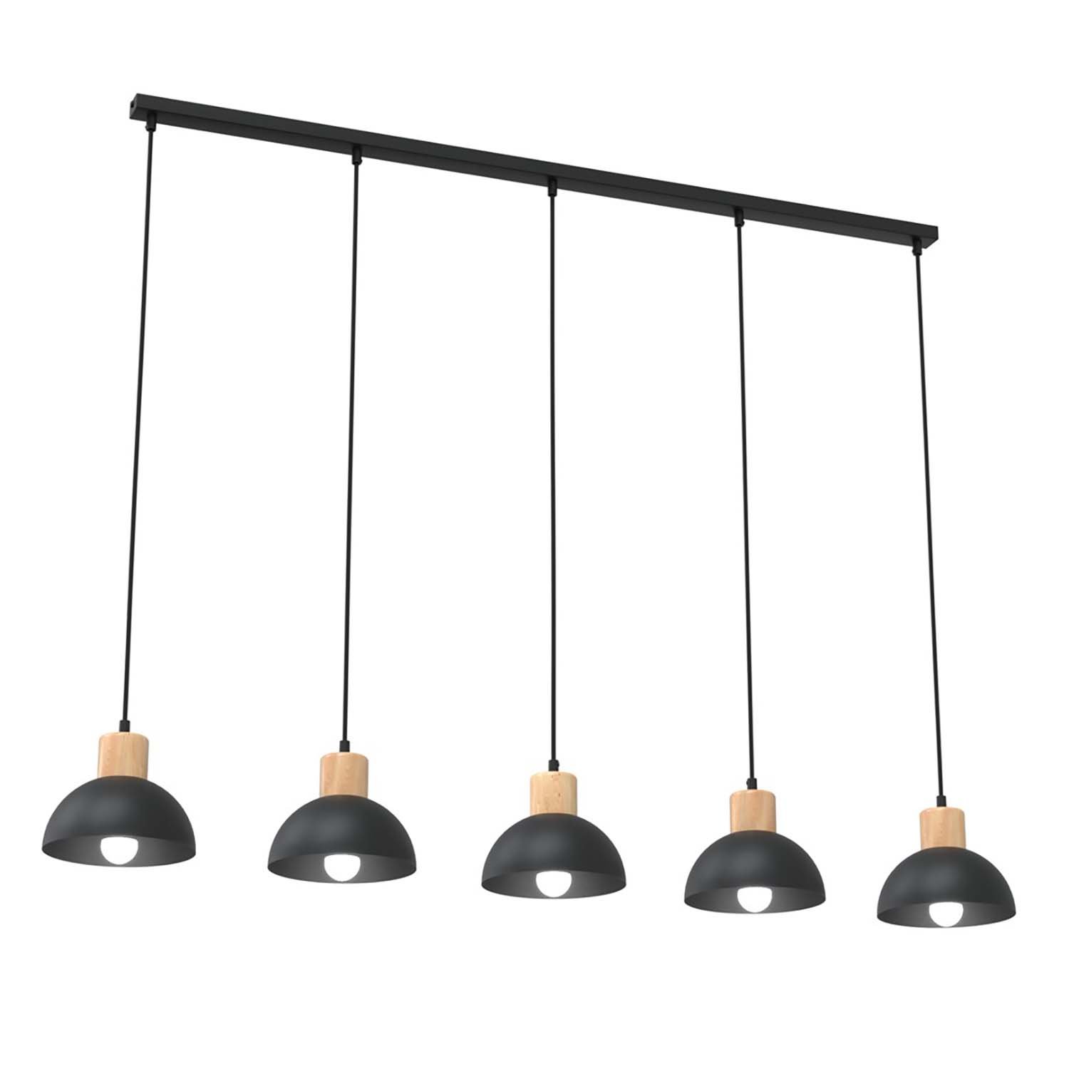 Sospensione Nordica 5 Luci Thoth In Acciaio Nero A Cupola E Legno Naturale